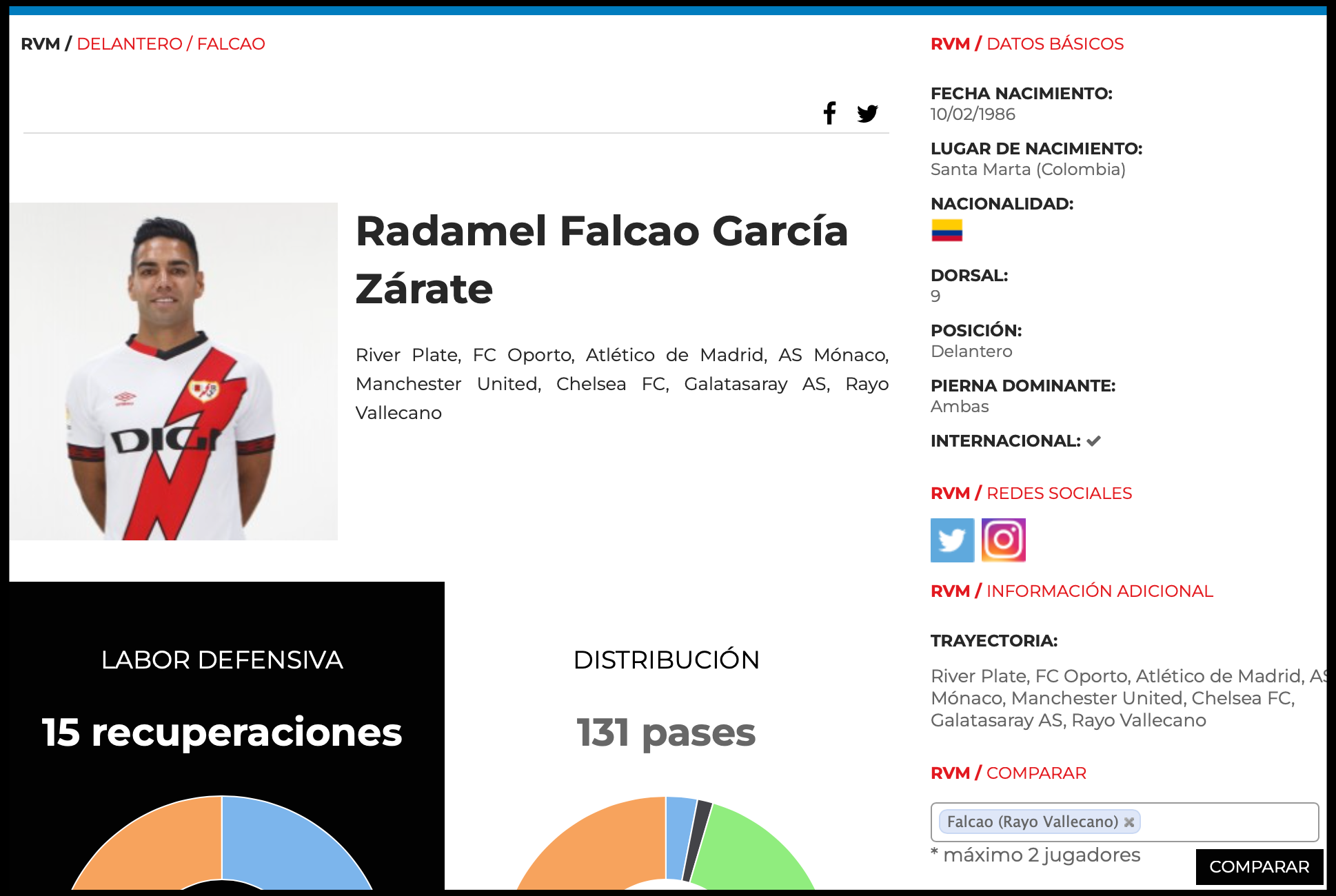 [사진 = 라다멜 팔카오. 현재 나이는 37세이며 올 시즌을 끝으로 현 소속팀과의 계약이 만료된다. 올 시즌 현재까지 라리가 20경기 2골 기록했던 점을 놓고 보면 전성기에서 완전히 내려왔음을 알 수 있다. (C) 라요 바예카노 공식 홈페이지 프로필 사진(rayovallecano.es)]