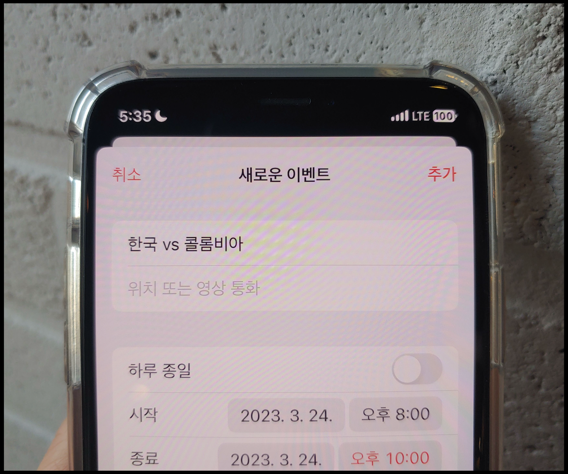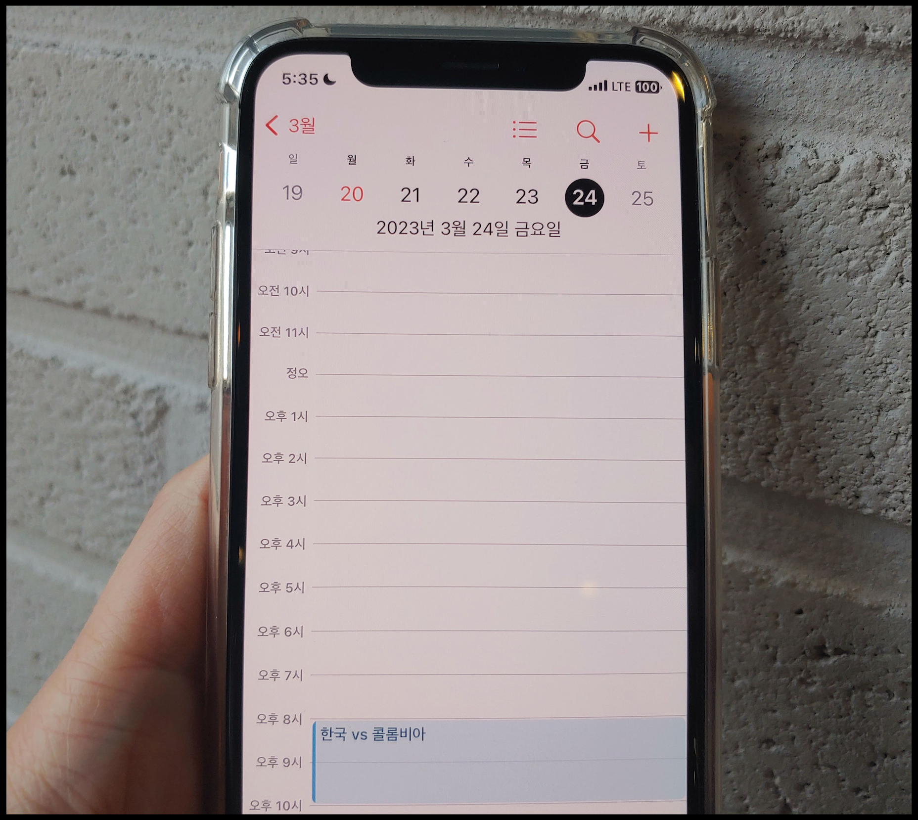 [사진 = 한국 콜롬비아 축구 A매치 맞대결이 2023년 3월 24일에 펼쳐진다. 사진은 글쓴이 스마트폰 달력이며 해당일을 가리킨다. (C) 나이스블루]