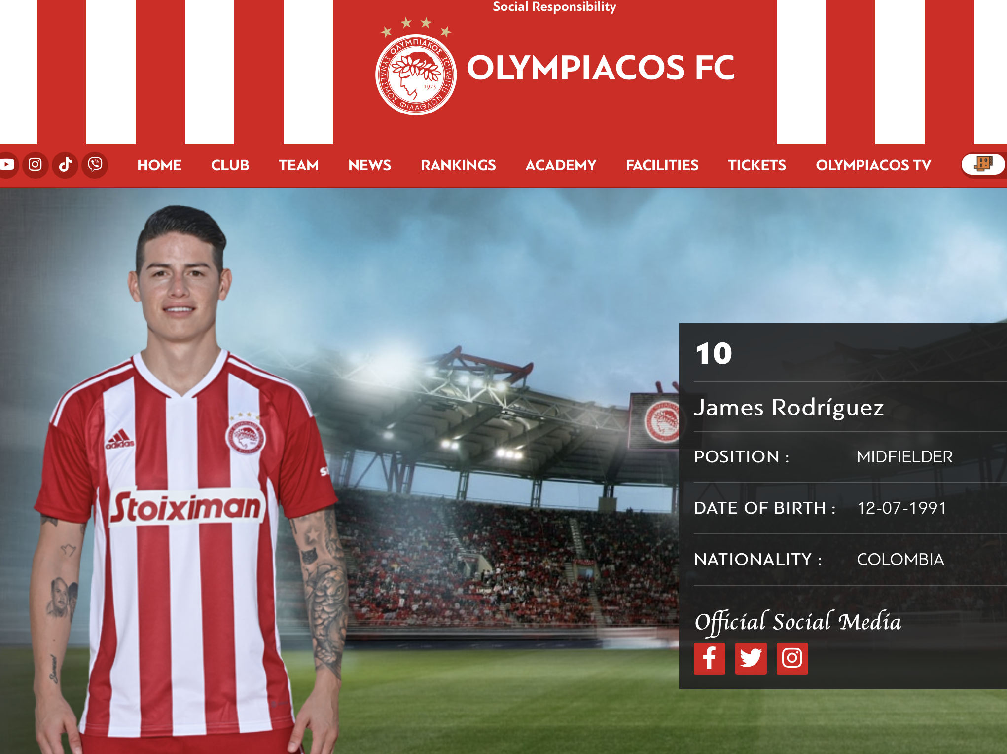 [사진 = 하메스 로드리게스. 현재 나이 31세인 점을 놓고 보면 전성기가 짧고 굵었을지 모른다. 한때 카타르 리그에서 활약했으나 올림피아코스에 합류하며 다시 유럽 무대에 컴백했다. (C) 올림피아코스 공식 홈페이지 프로필 사진(olympiacos.org)]