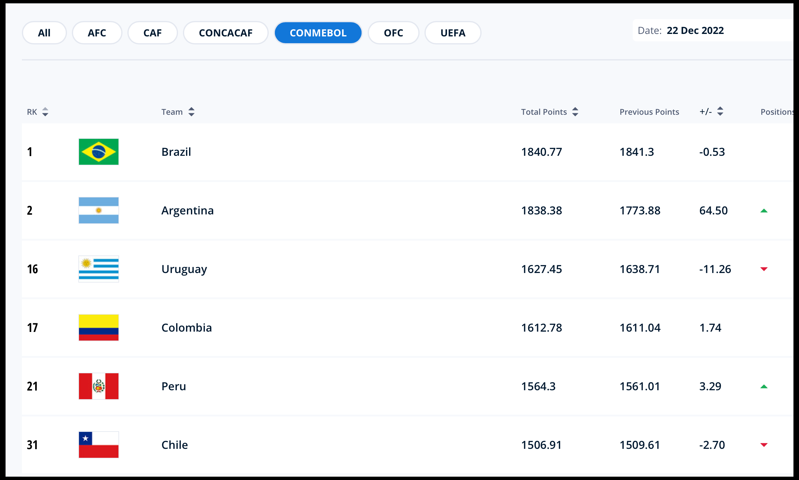 [사진 = 콜롬비아 피파랭킹 2022년 12월 22일 기준으로 17위이며 남미에서는 브라질(1위) 아르헨티나(2위) 우루과이(16위)에 이어 네 번째로 높다. (C) 국제축구연맹(FIFA) 공식 홈페이지(fifa.com)]