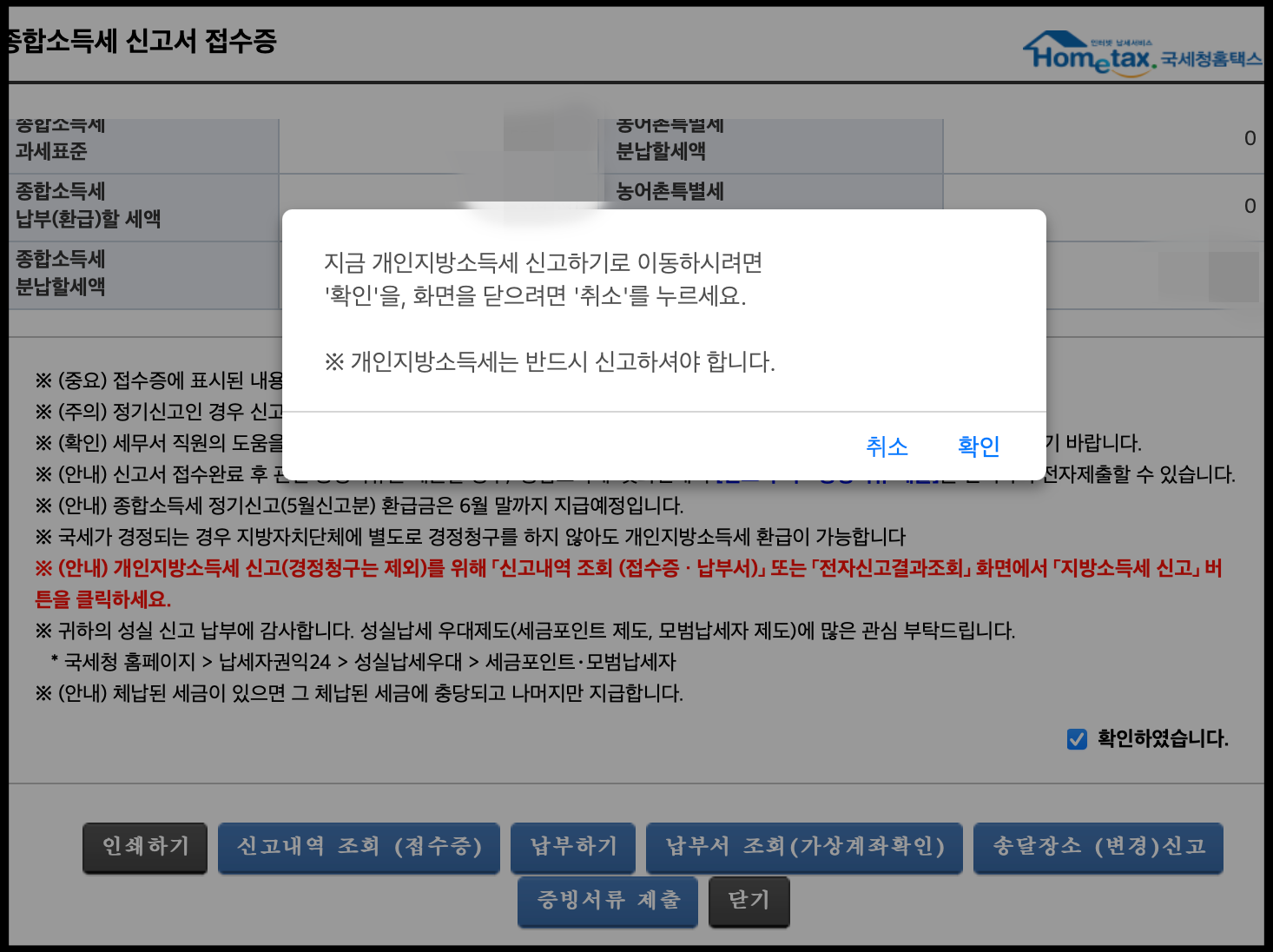 올해도 종합소득세 신고 완료했습니다. 개인지방소득세 신고 따로 하셔야 하는데 저 같은 경우에는 '닫기'를 선택한 뒤에 화면이 개인지방소득세 신고 이동으로 전환됐습니다. 개인지방소득세도 반드시 신고해야 한다고 합니다.