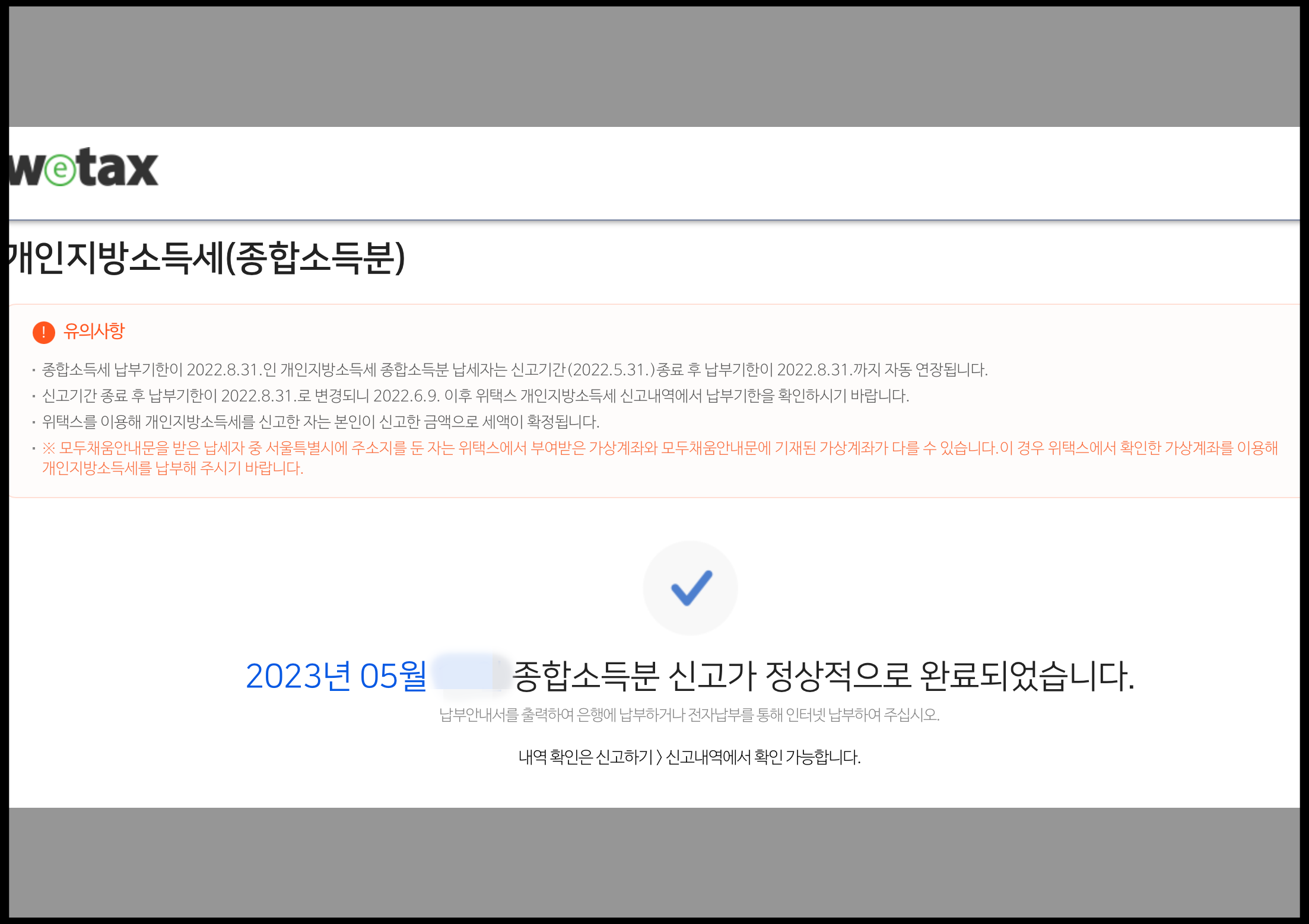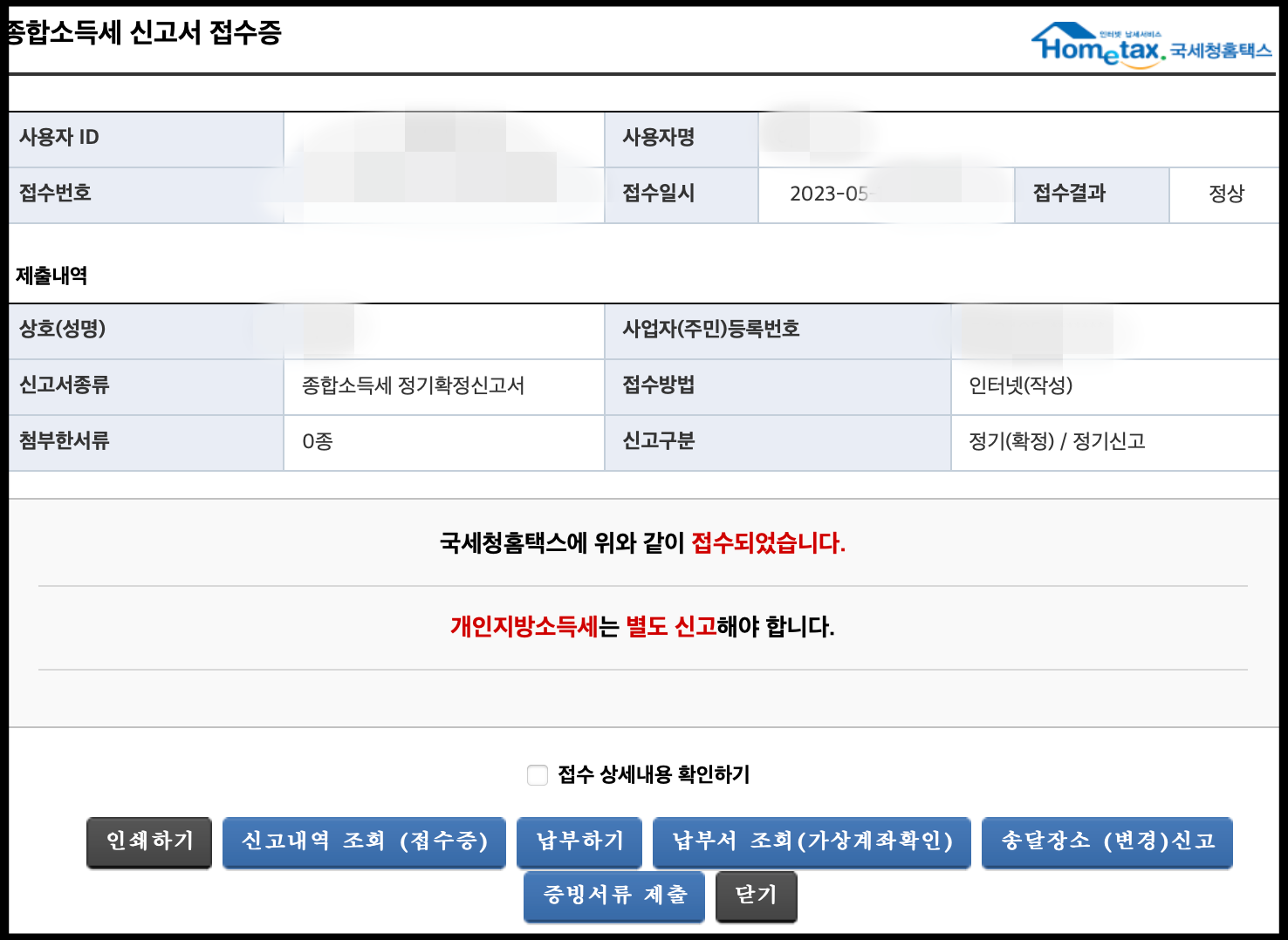 올해도 종합소득세 신고 완료했습니다. 개인지방소득세 신고 따로 하셔야 하는데 저 같은 경우에는 '닫기'를 선택한 뒤에 화면이 개인지방소득세 신고 이동으로 전환됐습니다. 개인지방소득세도 반드시 신고해야 한다고 합니다.
