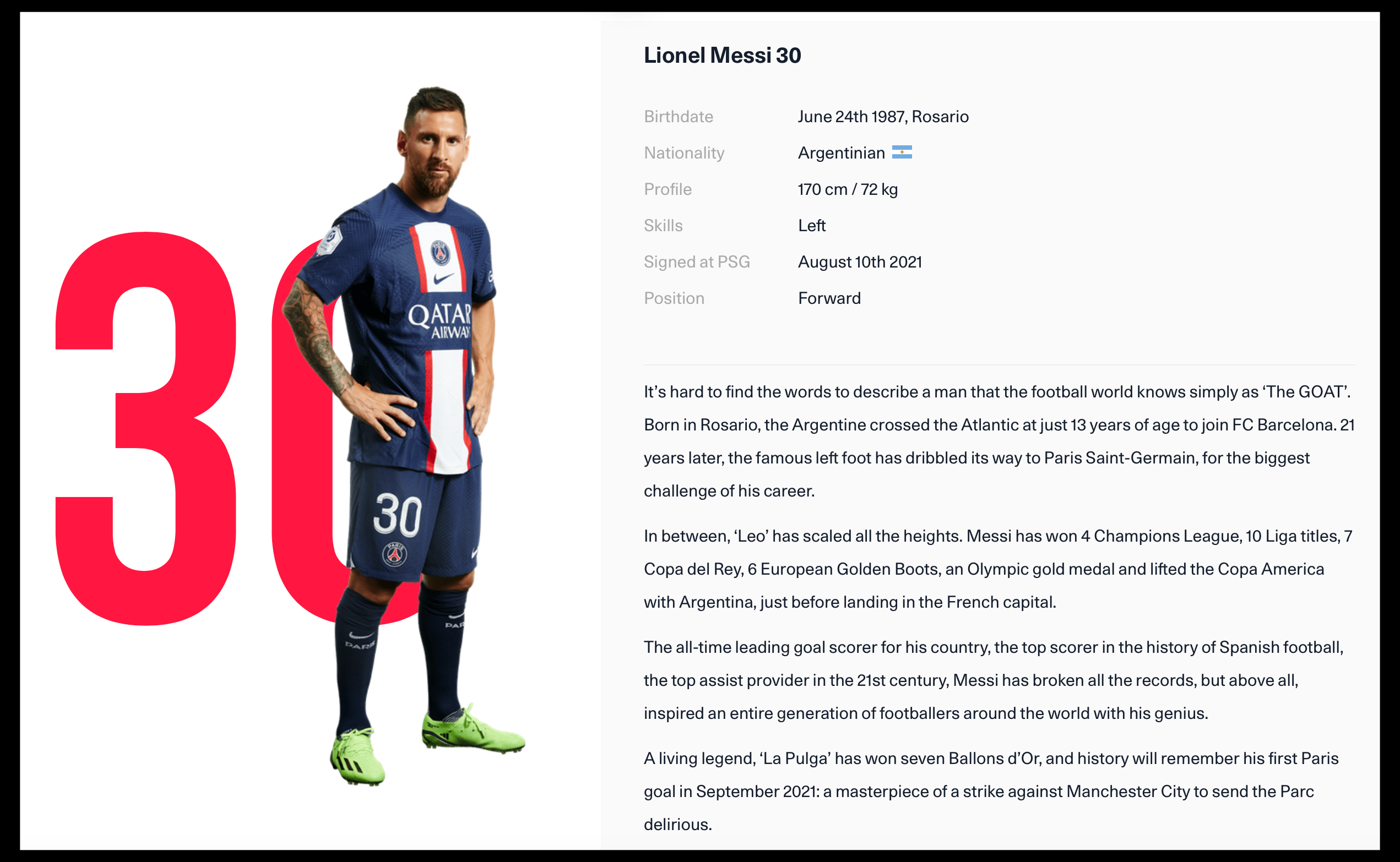 [사진 = 메시는 파리 생제르맹에서 두 시즌 동안 74경기 33골 34도움 기록했다. 비록 유럽축구연맹(UEFA) 챔피언스리그 우승은 없었으나 파리 생제르맹에서 활약하는 동안 2021 발롱도르, 2022 국제축구연맹(FIFA) 카타르 월드컵 우승으로 개인 커리어는 빛을 발했다. 파리 생제르멩에서는 2021/22, 2022/23시즌 리그1 우승 멤버로 활약했다. (C) 파리 생제르맹 공식 홈페이지 프로필 사진(psg.fr)]