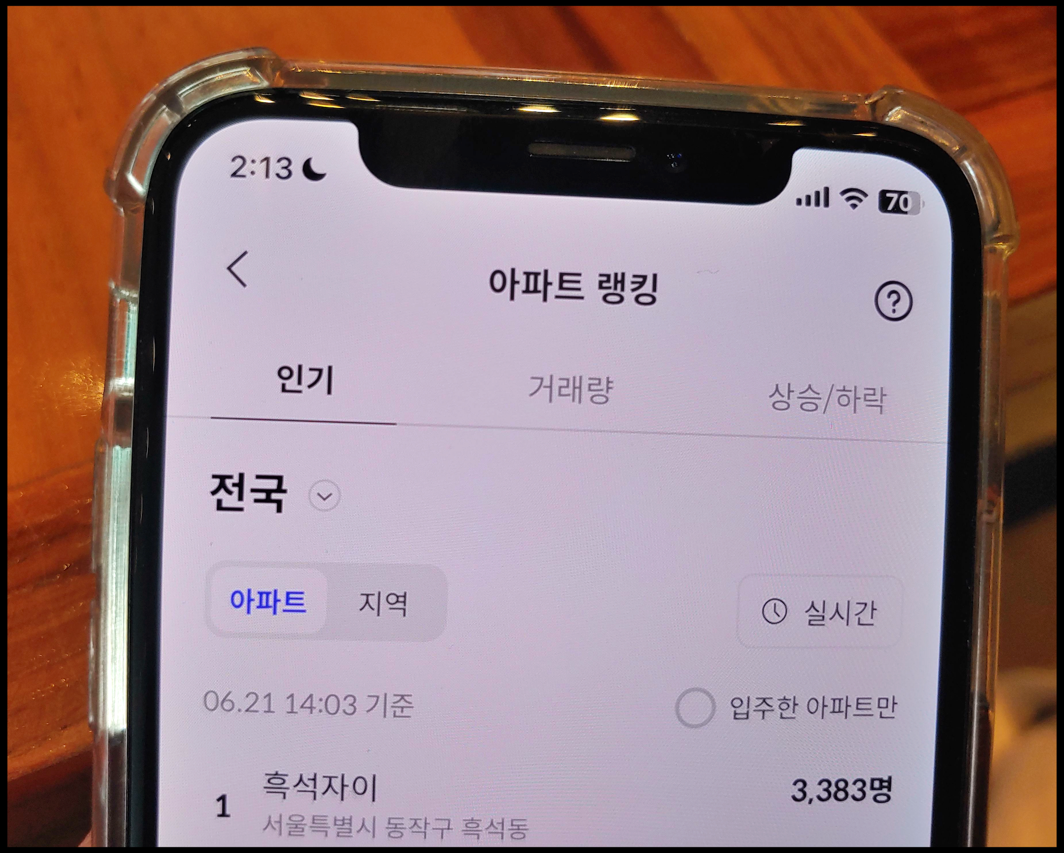 [사진 = 호갱노노 앱에 따르면 흑석자이 아파트 및 흑석동 검색어가 1위에 올라갔습니다. 전국적으로 이곳을 주목하는 분이 많다는 뜻입니다. 실제로 30~40대에서 관심도가 높다고 합니다. (C) 호갱노노 앱]
