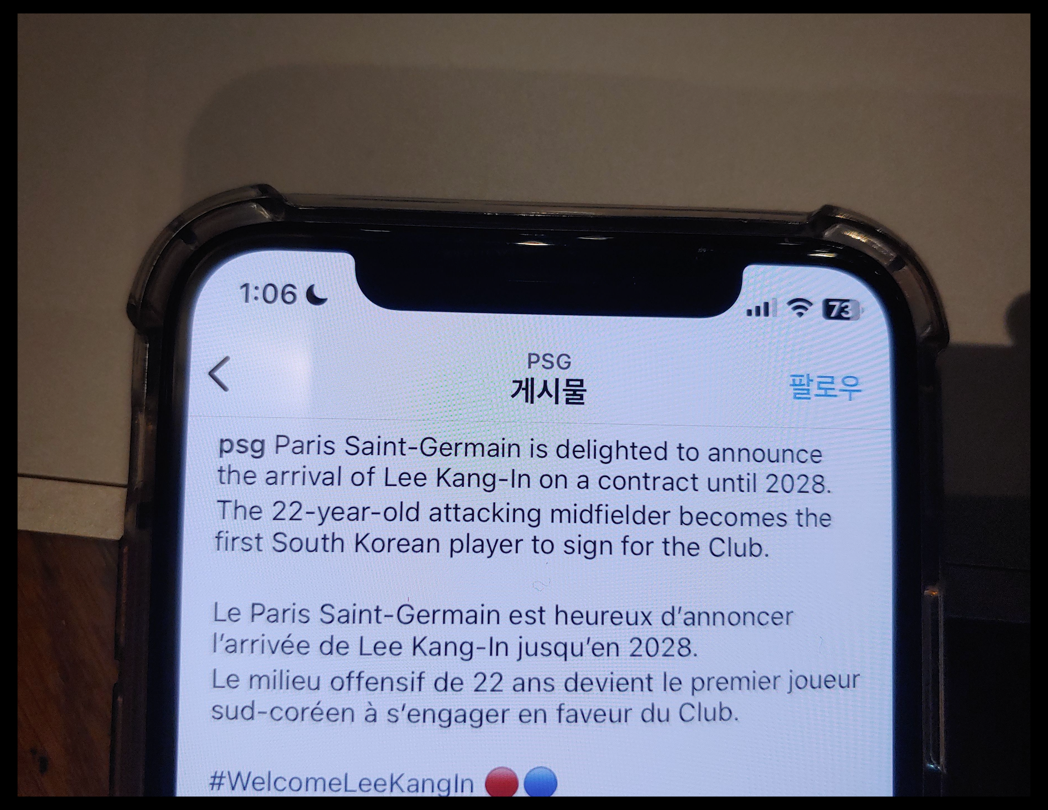 [사진 = 이강인 PSG 이적 발표됐다. 계약기간은 2028년까지이며, 22세 공격형 미드필더는 한국 선수 최초의 구단 영입이라는 것이 PSG의 입장이다. 아울러 한국인 선수의 프랑스리그 진출은 역대 13번째다. 여러 선수가 프랑스 무대에서 활약했으나 프랑스를 넘어 유럽의 빅 클럽으로 통하는 PSG 이적은 이강인이 최초다. (C) PSG 공식 인스타그램]