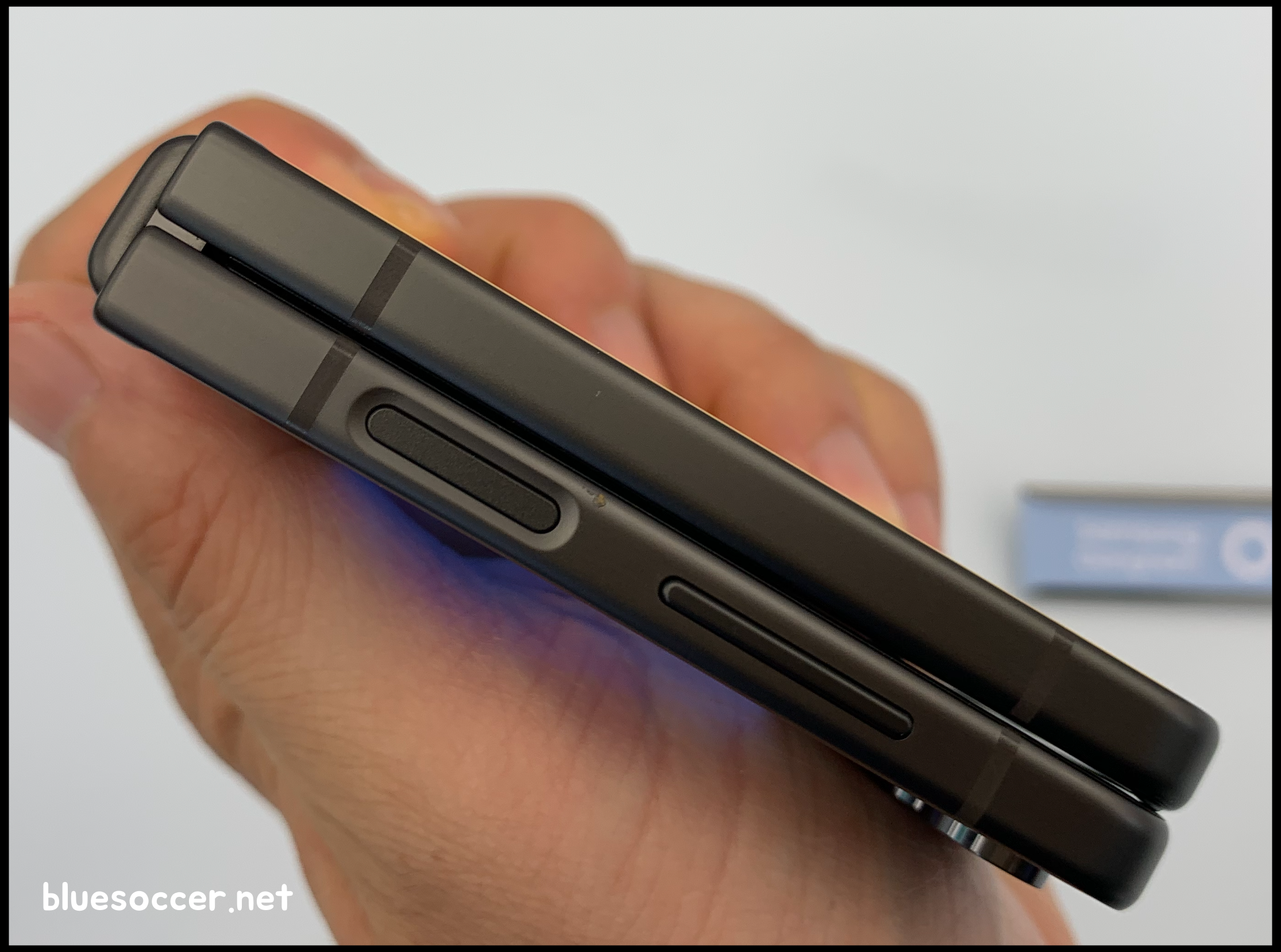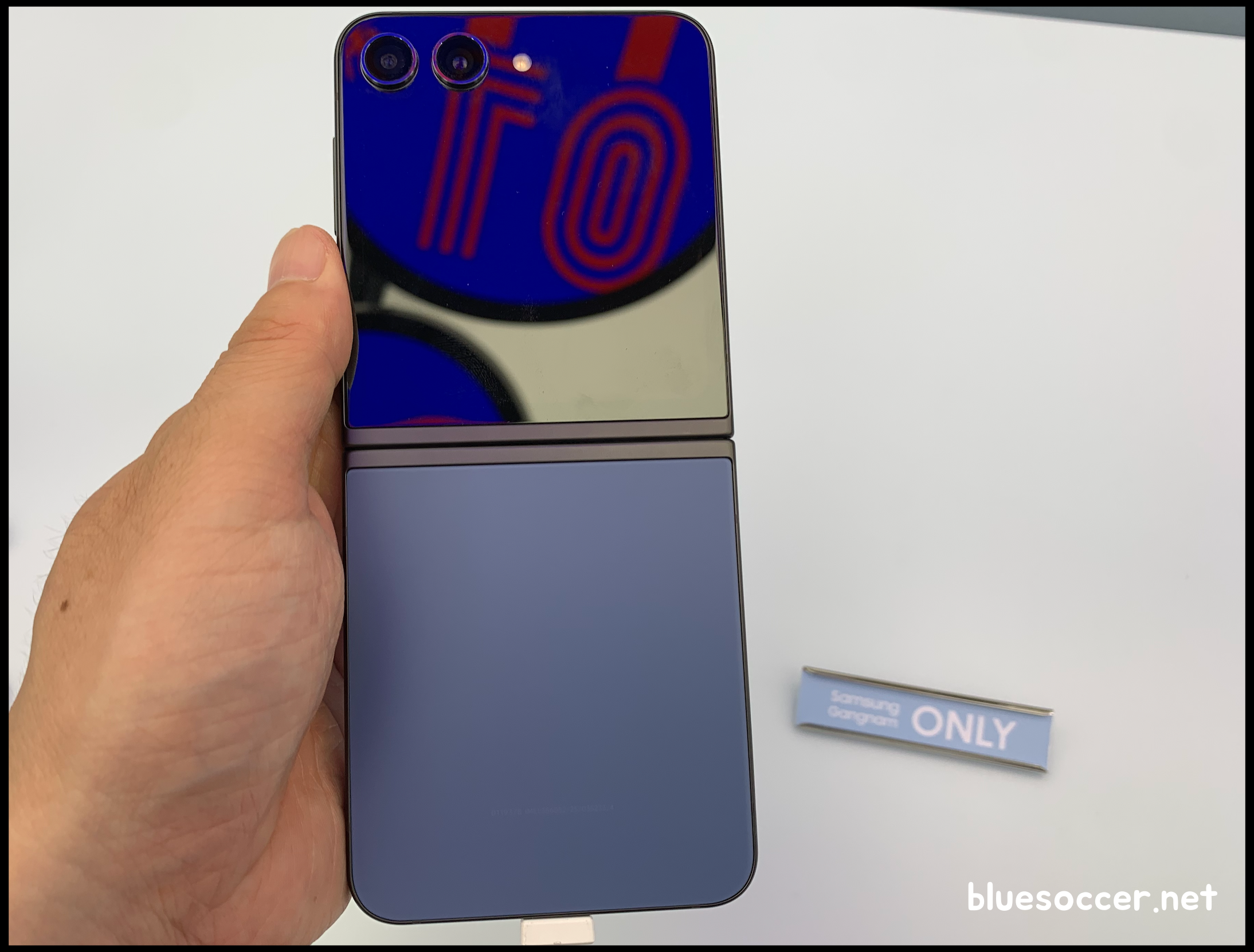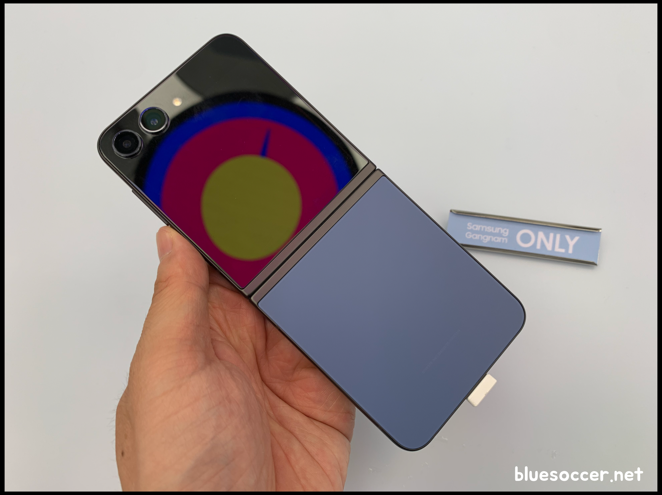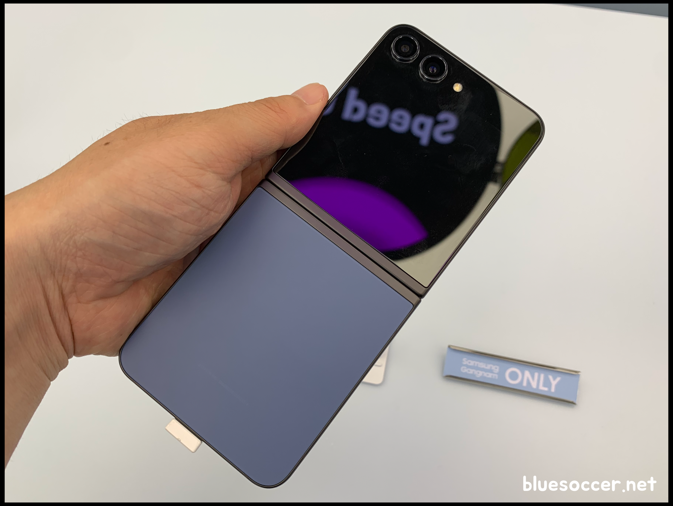 갤럭시 Z플립5 블루 색상 펼쳤을 때의 모습입니다. 후면 한 쪽은 커버 스크린이며 다른 한 쪽은 색상이 강조된 모습입니다. 블루 같은 경우 전작의 블루와 톤이 다른 느낌으로 보였습니다. 전작은 밝고 옅은 톤, 이번작은 어두운 톤입니다. 네이밍은 같은 블루인데 톤이 대조적입니다. 만약 블루 색상 찾는 분이라면 이 부분 참고하시면 좋을 듯합니다.