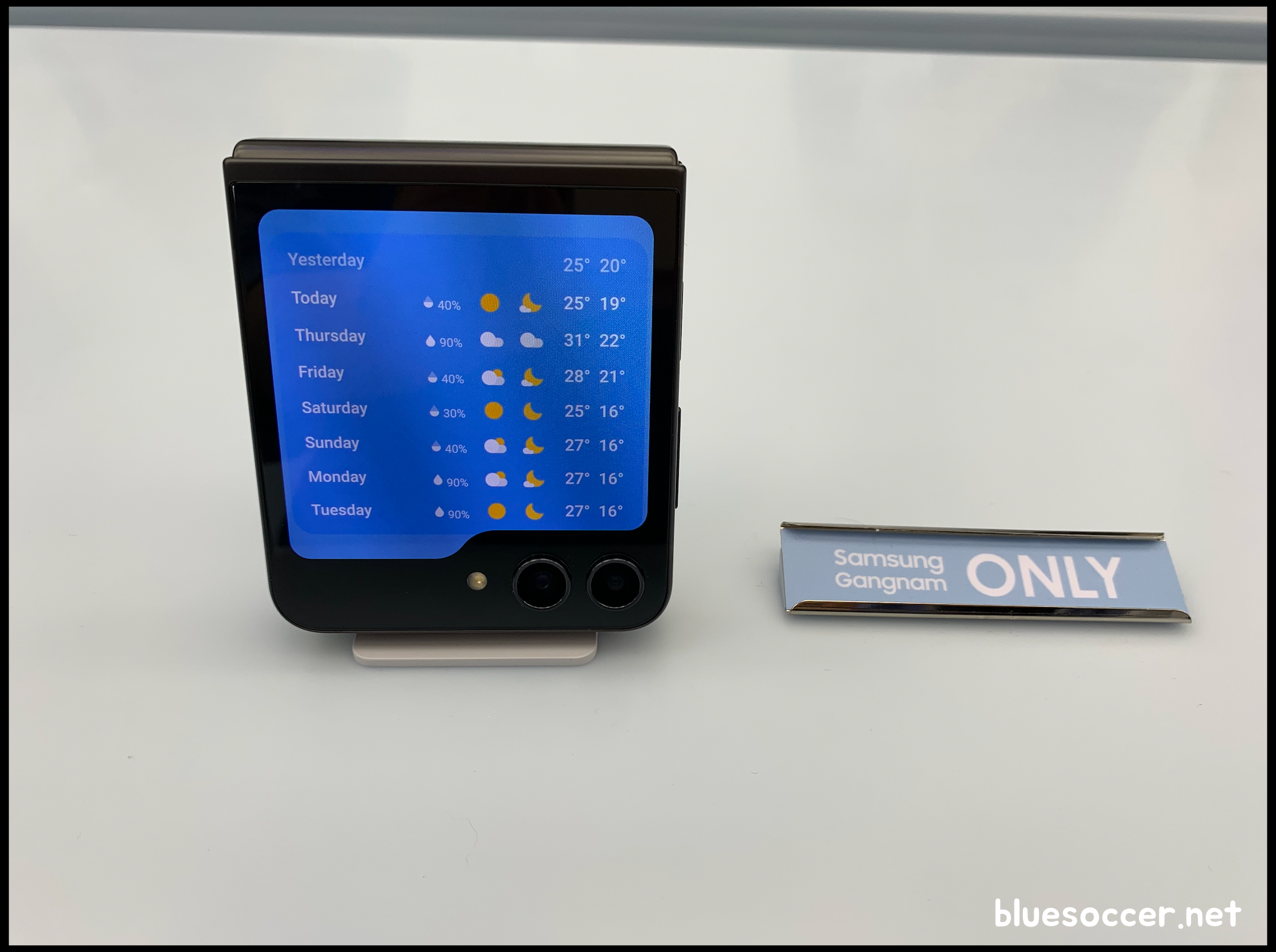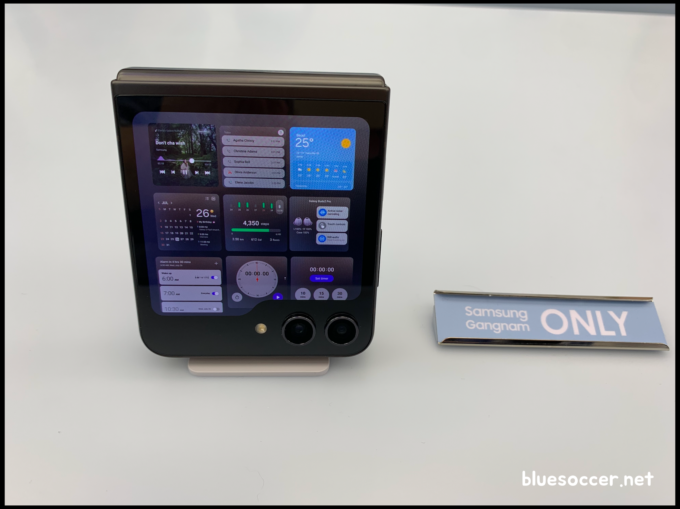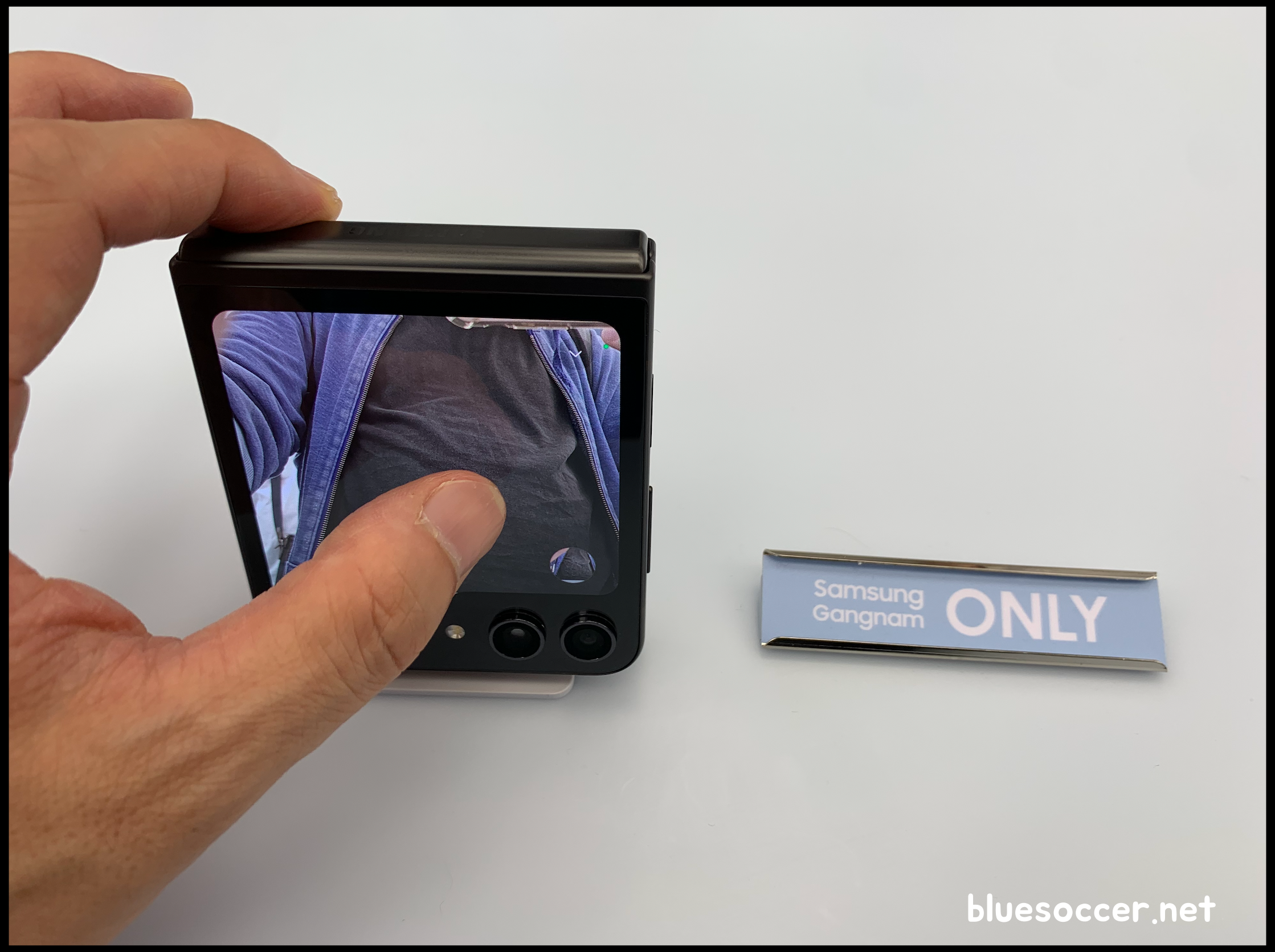 갤럭시 Z플립5 사용하는 사람을 단번에 알아내는 방법이 있습니다. 커버 스크린에 해당하는 플렉스 윈도우 영역이 잘 보입니다. 크기가 전작의 1.9인치에서 더 늘어난 3.4인치가 됐습니다. 스마트폰을 펼치지 않아도 커버 스크린을 통해서 제품의 주요 기능을 이용할 수 있는데 이전작들에 비해 사용 가능한 기능이 더 늘어났다고 들었습니다. 사진 및 동영상도 더 편리하게 찍을 수 있습니다. 셀카 포즈를 어떻게 취해야 할지 커버 스크린이 잘 보여서 좋은 점이 있습니다. 젊은 여성분들에게 수요가 있을만한 기능입니다.
