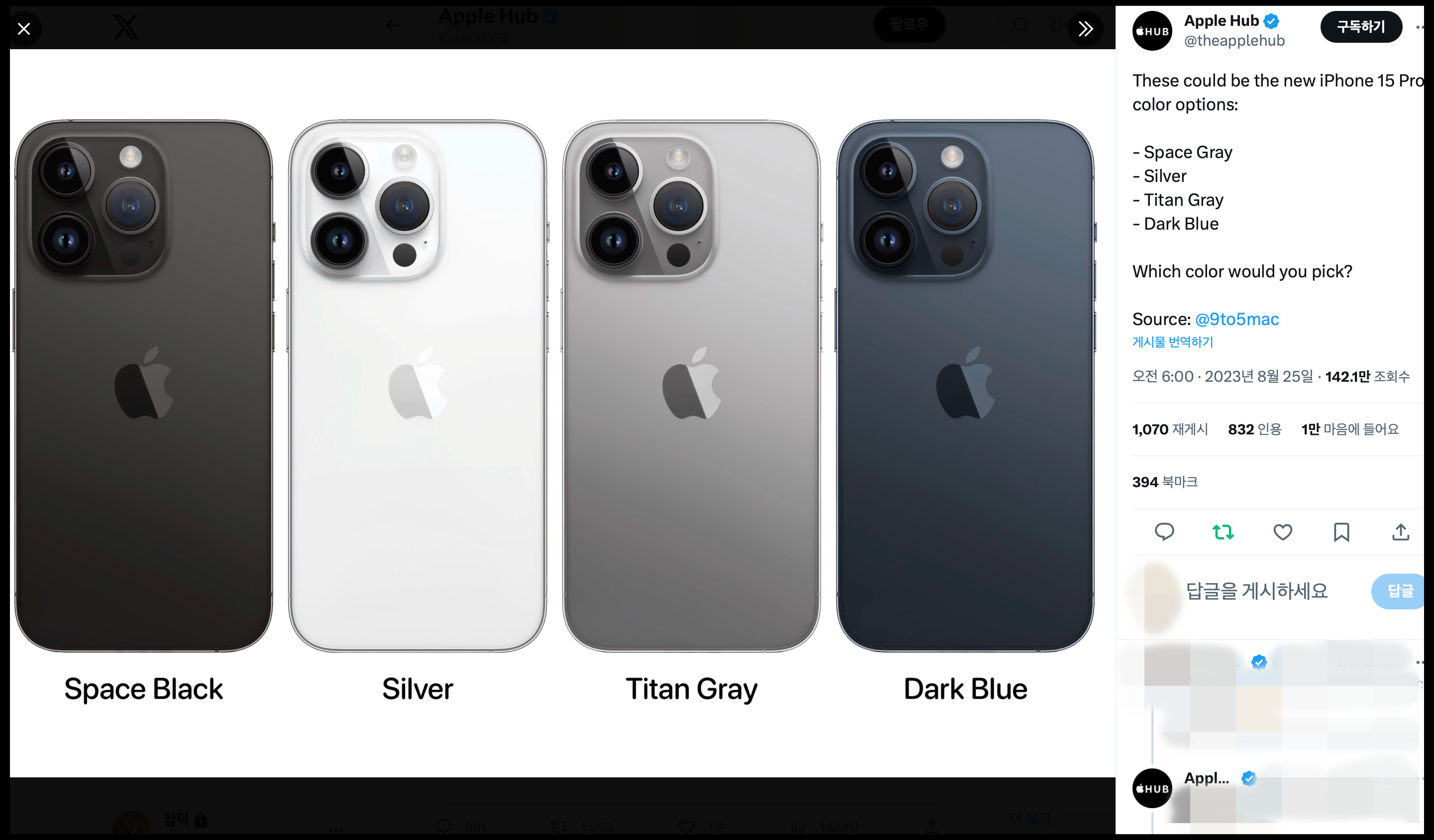 아이폰15 프로 색상 현재 시점에서는 이렇게 예상되는 분위기입니다. 해외 트위터 계정인 애플 허브(@theapplehub)에서는 애플 전문 미디어로 유명한 9to5Mac 기사를 인용하며 4종 출시 가능성을 예상했습니다. 스페이스 블랙, 실버, 티탄 그레이, 다크 블루 색상으로 말입니다. 만약 이 보도가 맞다면 스페이스 블랙과 실버는 전작에 이어 이번작에서도 선보이게 됩니다. 다른 2개의 색상인 아이폰15 프로 다크 블루 및 티탄 그레이 같은 경우 이번에 처음으로 도입됩니다. 여기서 눈에 띄는 점이 하나 있습니다. 그동안 아이폰 단골 색상 중에 하나였던 골드가 없습니다.