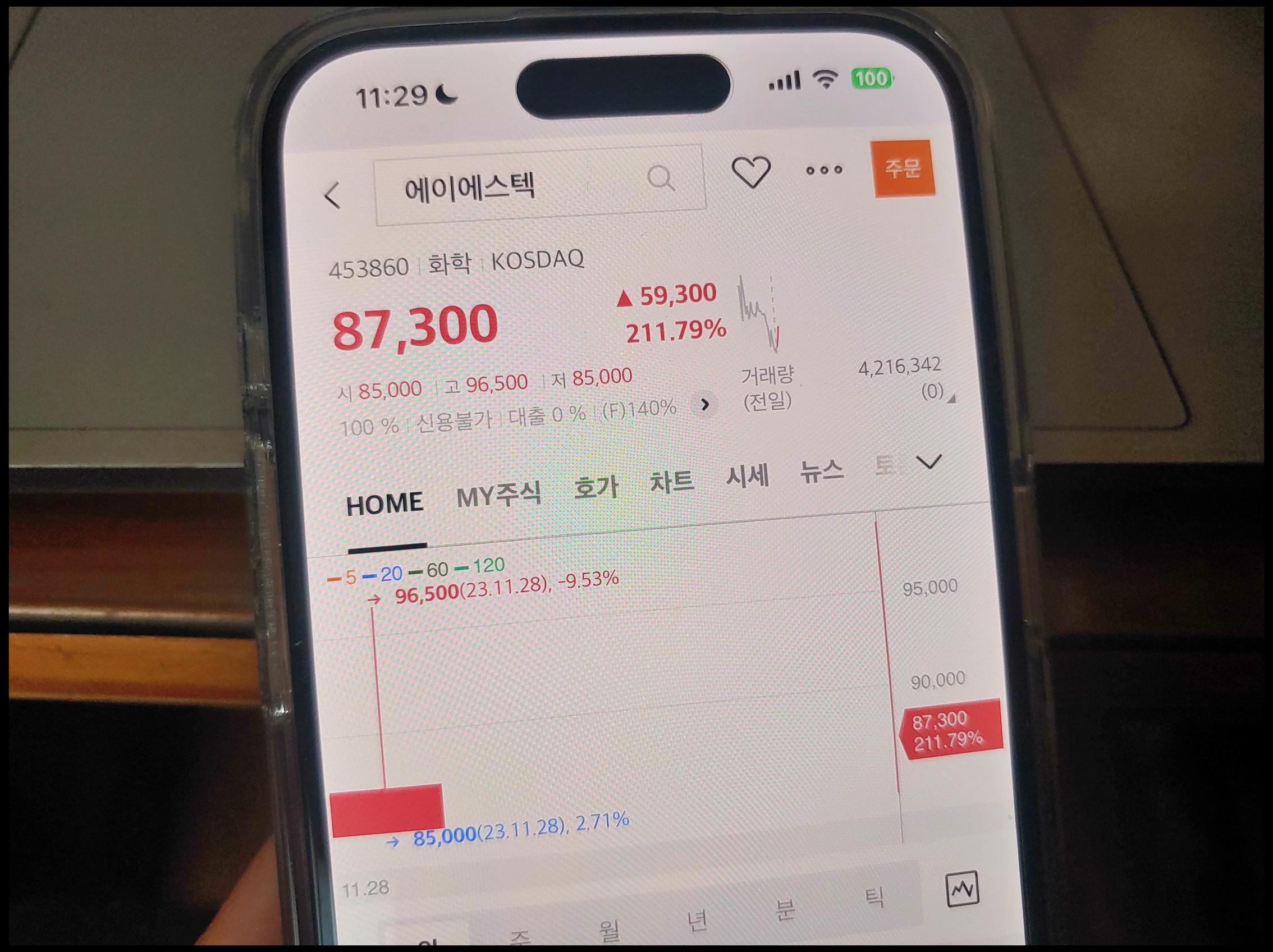 에이에스텍 공모가 어떻게 되는지 알고 싶어하는 분이 많을 것으로 보입니다. 2023년 11월 28일 오늘 주식 시장 최대의 화제가 바로 이 종목이기 때문입니다. 오늘 상장했던 종목입니다. 얼마 전 미래에셋증권 통해서 일반 투자자들의 청약이 진행되었으며 청약건수는 356,373건 이었습니다. 균등 및 비례 수량이 각각 175,875주로서 1주 받기 위한 경쟁이 매우 치열했습니다. 1인당 균등 배정 수량 0.49주, 비례 1주 금액 38,485,860원이었습니다. 저는 에이에스텍 균등 1주 받으면서 100명 중에 49명 안에 드는 행운을 누렸습니다. 그 결과 이 종목이 오늘 오전에 상장하면서 200% 이상의 수익률 기록했습니다.