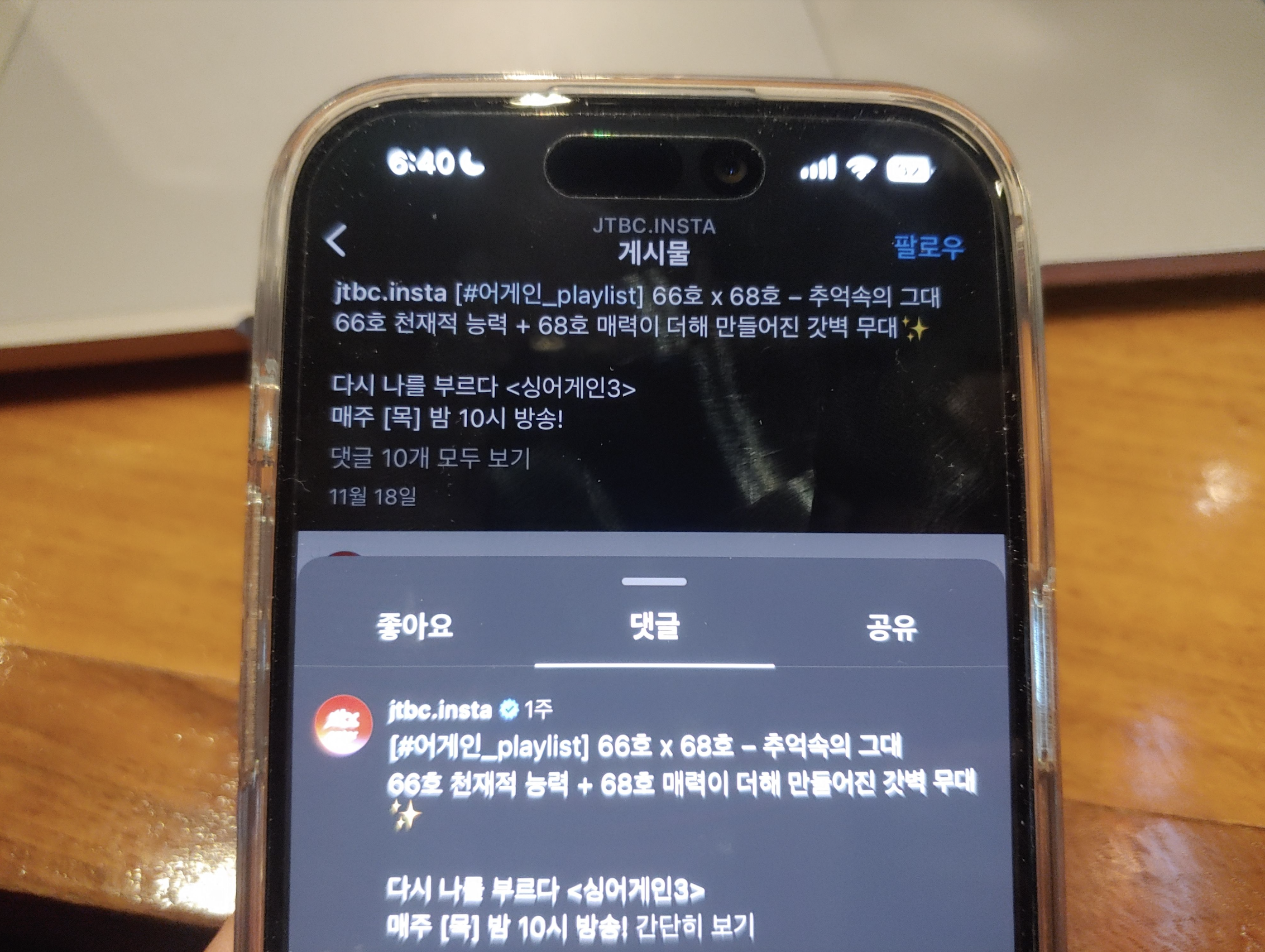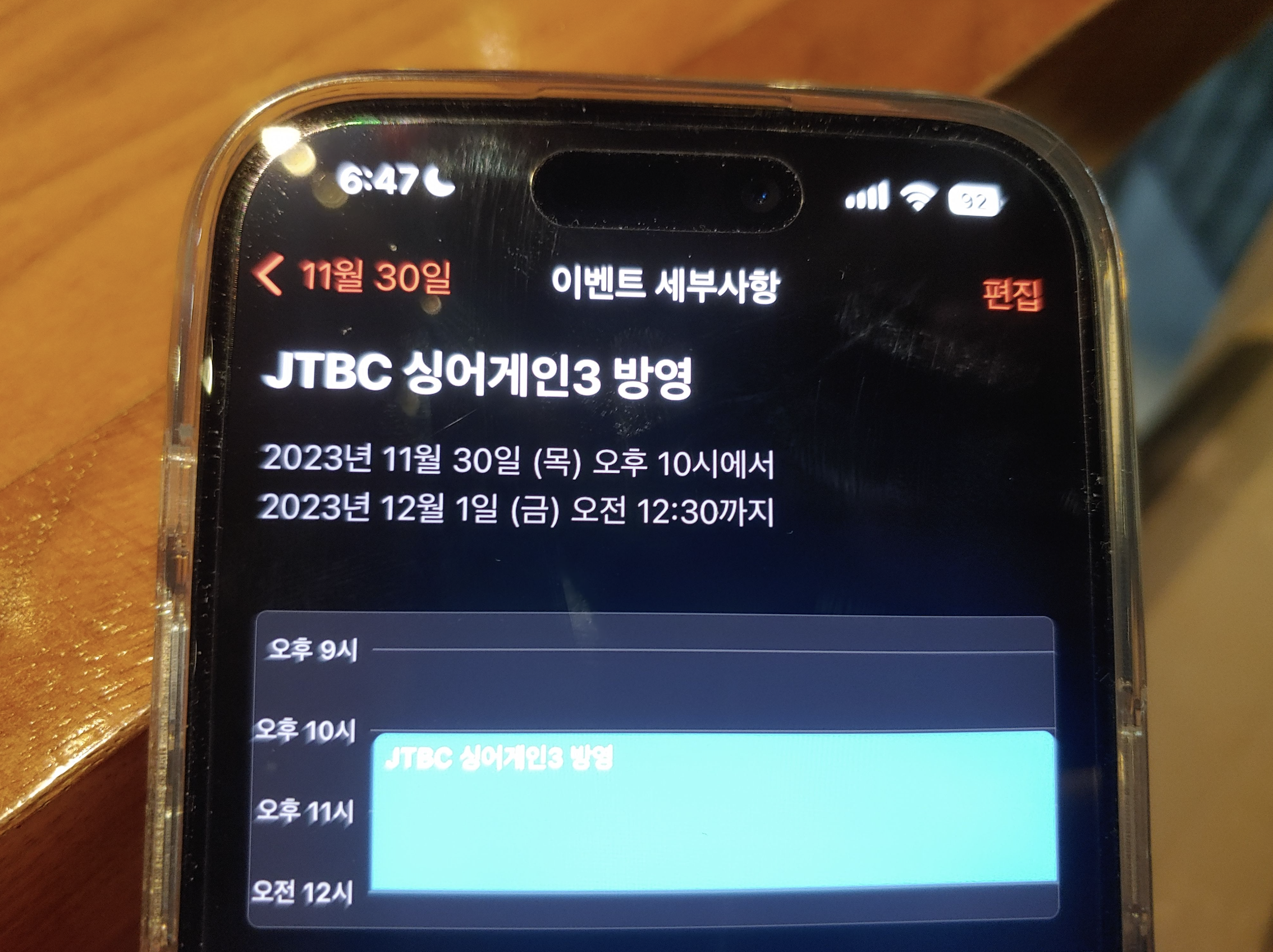 [사진 = 2023년 11월 30일 JTBC 싱어게인3 6회 방영 예정입니다. 3라운드가 치러지는 모습을 볼 수 있습니다. 과연 싱어게인3 68호 가수 leejean 3라운드 무대 모습이 공개될지는 알 수 없습니다. 이 프로그램이 1~2라운드를 통해 참가자들이 계속 탈락하는 중이어서 3라운드에서는 대부분의 참가자 경연 모습이 나올 것으로 예상됩니다. 사진은 저의 스마트폰 달력이며 해당일을 가리킵니다. (C) 나이스블루]