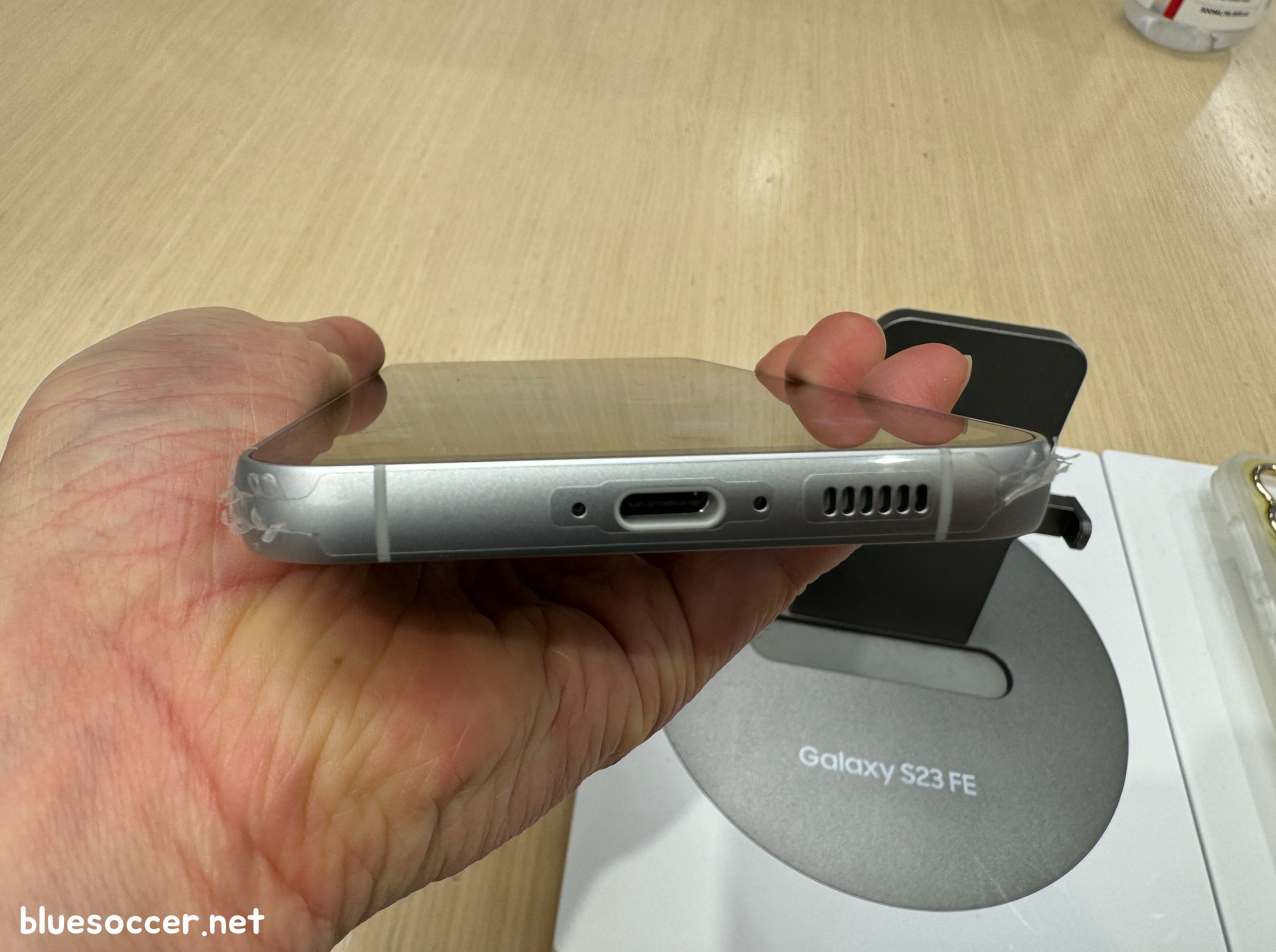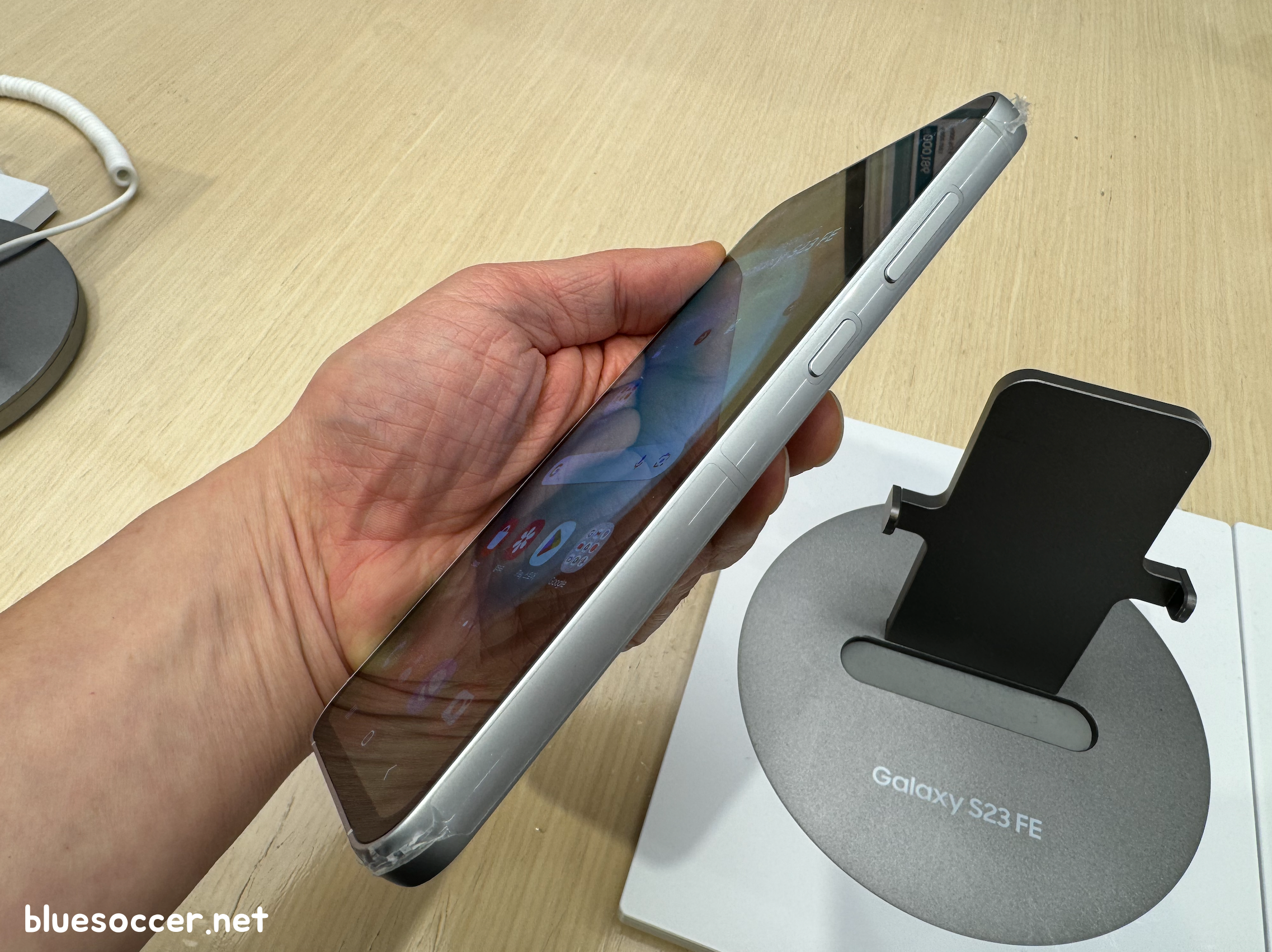 갤럭시 S23 FE 테두리 모습 이렇습니다. 특히 오른쪽에 볼륨키와 전원키가 함께 있습니다. 볼륨키가 전원키보다 위에 있어서 개인적으로 처음에는 적응이 되지 않았는데, 만약 해당 스마트폰 사용 예정이신 분이라면 이 부분에 대한 적응이 필요할 수도 있습니다.
