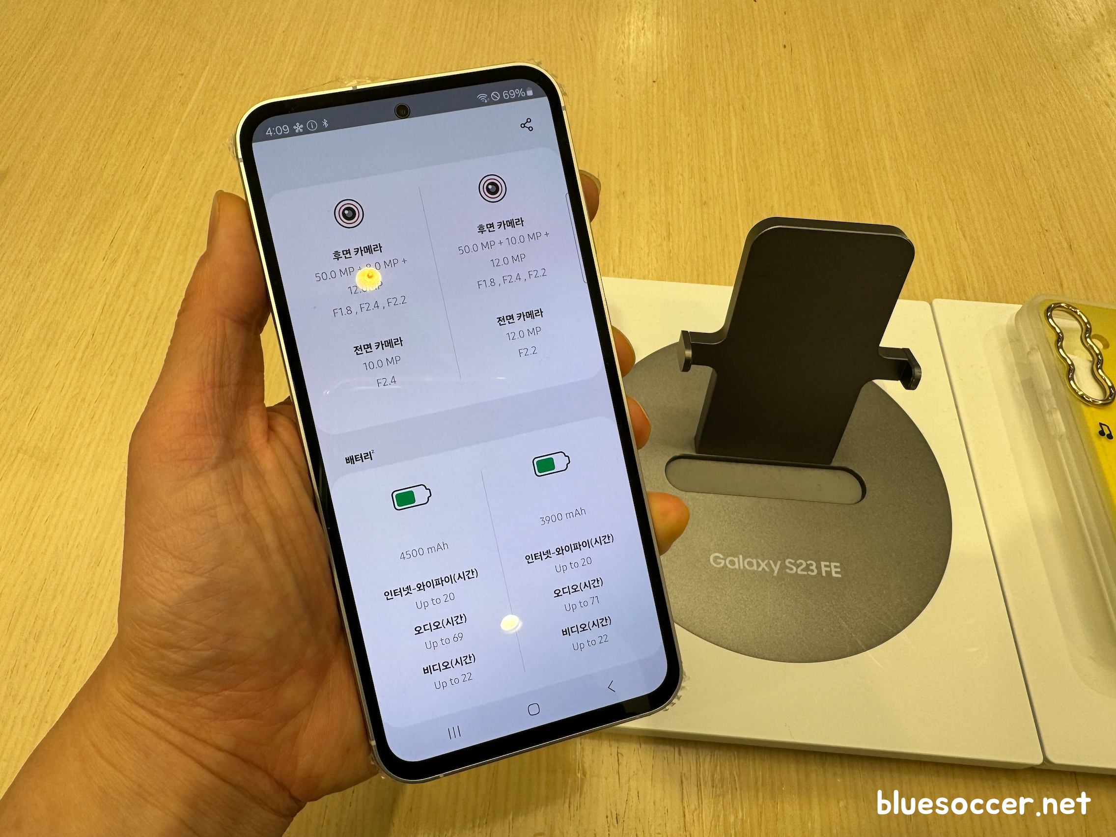 갤럭시 S23 FE 스펙 중에서 만족스러웠던 부분이 배터리 4,500mAh 입니다. 용량이 넉넉한 편입니다. 이 정도면 좋다고 볼 수 있습니다.