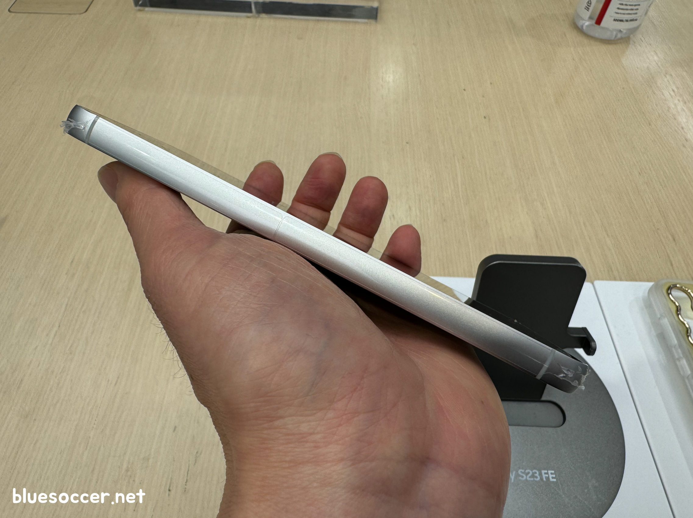 삼성전자 갤럭시 S23 FE 실물 실제로 만져보면 묵직했습니다. 갤럭시 S23 기본형보다 디스플레이가 0.3인치 크면서, 두께도 0.6mm 더 두껍습니다. 무게 차이도 꽤 있습니다. 갤럭시 S23 FE 무게 209g으로서 갤럭시 S23 무게 168g보다 41g 더 무겁습니다.