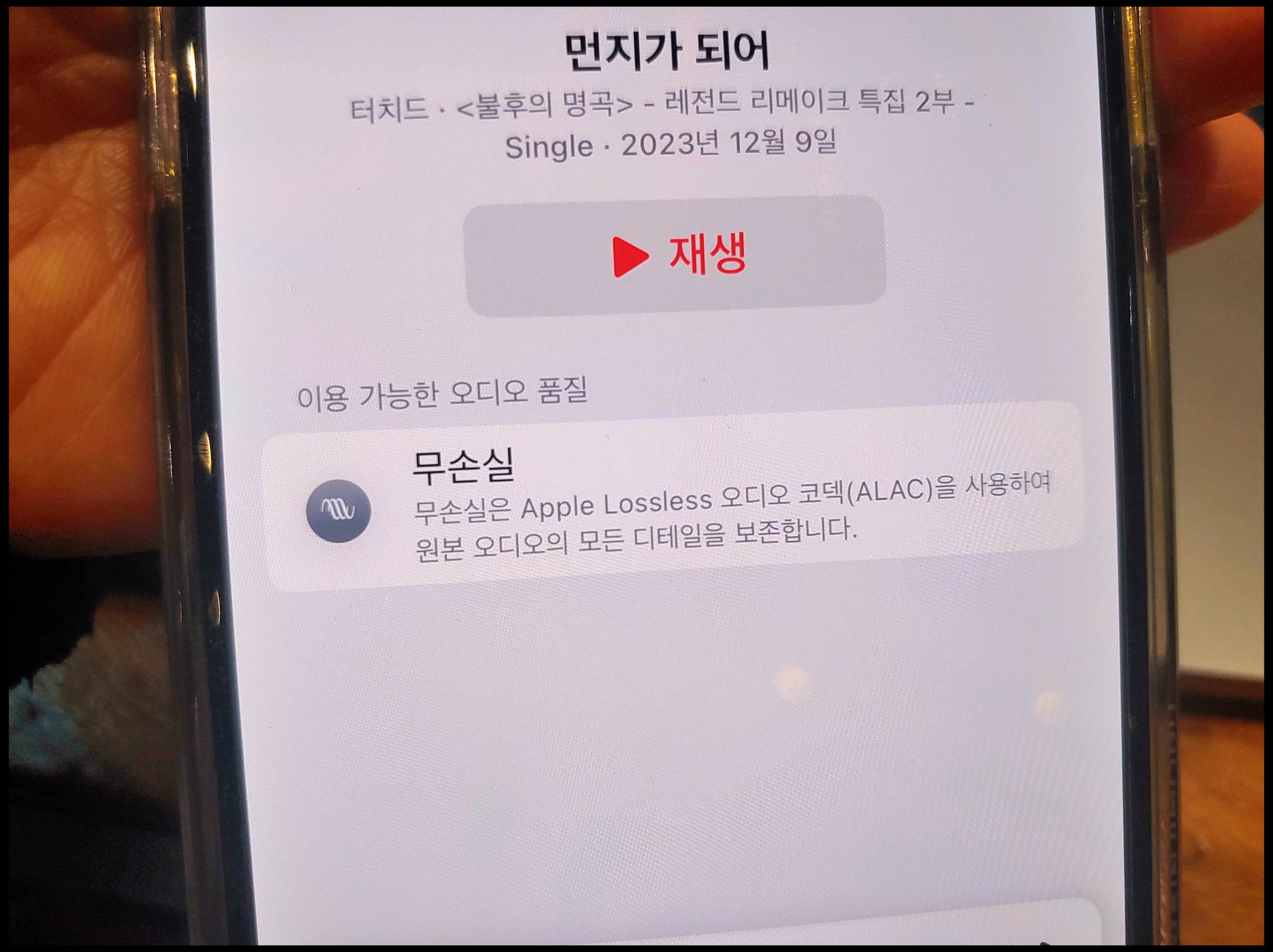 [사진 = 애플뮤직에 최근 올라왔던 터치드 노래는 불후의 명곡 경연곡이었습니다. 12월 9일 방영분이었던 레전드 리메이크 특집 2부에서 먼지가 되어 선보였습니다. 와이파이 환경에서 애플뮤직 노래를 들을 때 무손실 음원을 들을 수 있습니다. 에어팟에서 듣기 편합니다. (C) 애플뮤직 앱]