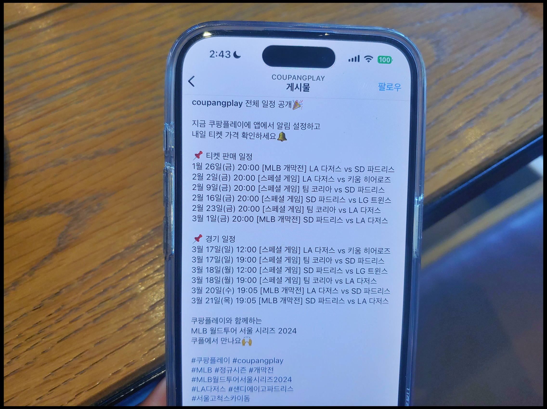 [사진 = 쿠팡플레이 인스타그램에서는 2024 메이저리그 개막전 예매 일정 공개했습니다. LA 다저스와 샌디에이고 파트리스의 2경기(3월 20일, 3월 21일) 및 스페셜 게임 4경기(3월 17일 12:00, 19:00 / 3월 18일 12:00, 19:00) 일정입니다. 스페셜 게임 상대는 키움 히어로즈(김하성 전 소속팀, 고척 스카이돔 연고팀), LG 트윈스(고우석 전 소속팀), 팀 코리아 입니다. 총 6경기 중에 3월 20일 개막전 1차전 티켓팅 오는 1월 26일 금요일 오후 8시부터 시작합니다. 2차전 티켓팅은 3월 1일 예정이며 2월 2일, 9일, 16일, 23일 스페셜 게임 티켓팅 예정입니다. (C) 쿠팡플레이 인스타그램]