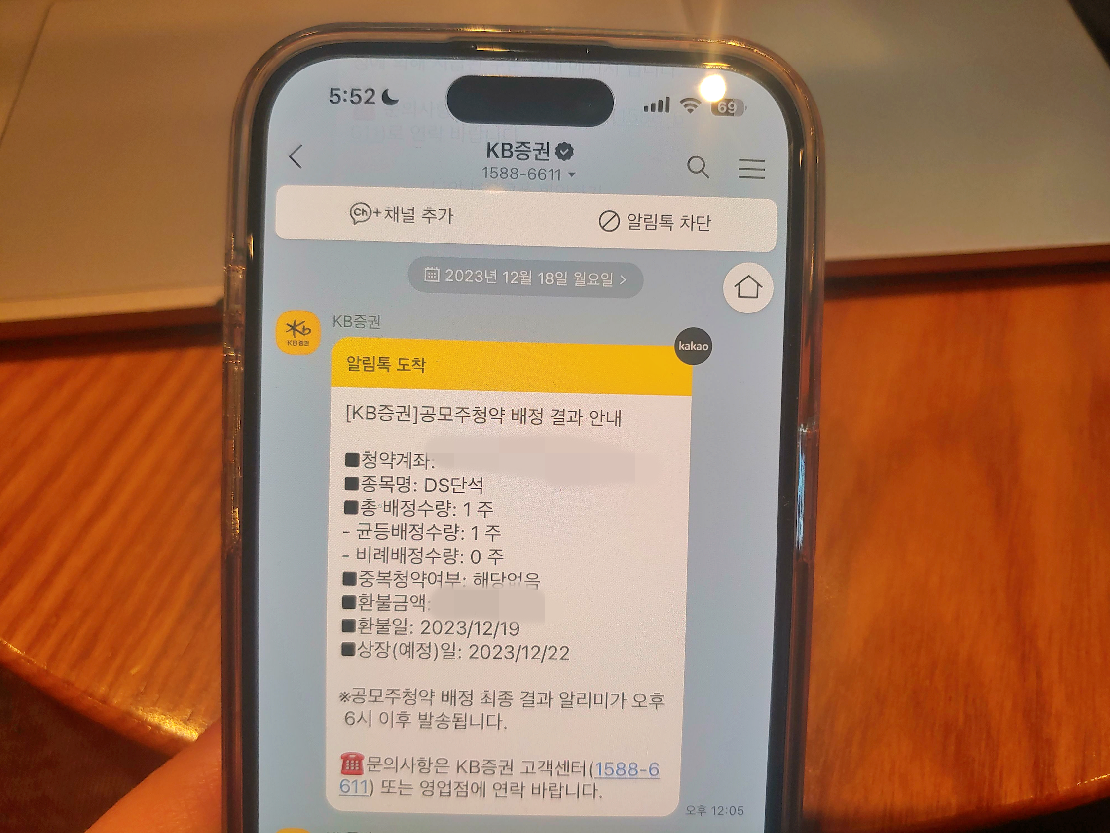 [사진 = 개인적으로는 DS단석 균등 1주 배정 받았던 적이 있습니다. (C) 카카오톡 앱]
