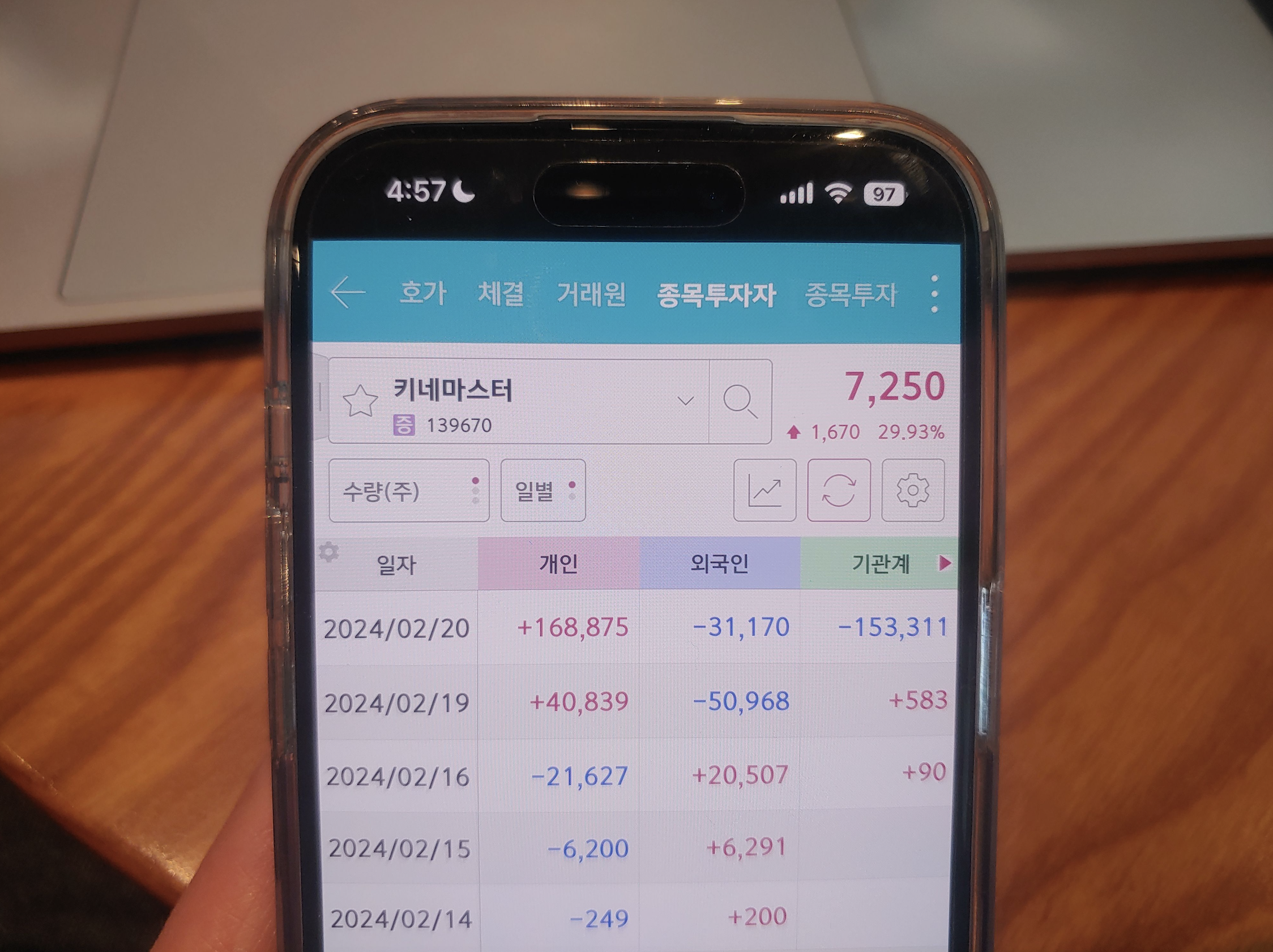 [사진 = 실제로 키네마스터 주가 2월 19일과 20일에 30% 올랐습니다. 2월 16일 4,295원에서 2월 19일 5,580원, 2월 20일 7,250원이 됐습니다. 국내증시에서는 일반적으로 이러한 종목이 개인 투자자는 매도를 많이 합니다. 그런데 이 종목이 Sora AI 관련주 떠오르게 되면서 2월 19일과 20일에 개인 투자자들이 많이 매수했습니다. 반대로 2월 20일에는 외국인과 기관들이 해당 종목 매도하는 경향이 강했습니다. 결국 개인 투자자들이 이틀 연속 30% 올렸다고 보시면 됩니다. 다만, 이 글은 해당 종목 투자를 권유하는 목적이 아님을 참고하시기 바랍니다. (C) 키움증권 영웅문S# 앱]