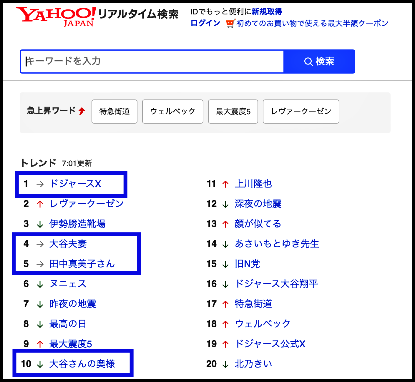 [사진 = 일본 최대의 포털 사이트 야후재팬에서는 다나카 마미코(田中 真美子) 실시간 검색어 상위권에 떴습니다. 5위에 이름이 올랐습니다. 1위 다저스 X(구 트위터) 4위 오타니 부부(大谷夫妻)도 최상단에 나왔습니다. 일본에서는 인스타그램보다 트위터를 더 많이 활용하기 때문에 다저스 트위터 접속을 더 많이했던 것 같습니다. (C) 야후재팬 공식 홈페이지(yahoo.co.jp)]