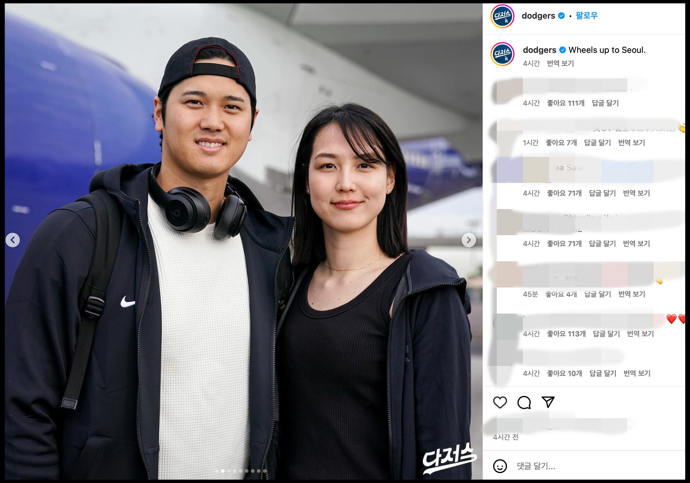 [사진 = LA다저스 공식 인스타그램에서 오타니 와이프 다나카 마미코 공개됐습니다. 구단의 X(구 트위터) 계정에도 올라왔습니다. 공식적인 채널에 처음 공개됐다는 점에서 눈길을 끕니다. 오타니 쇼헤이가 LA다저스의 메이저리그 개막전 서울시리즈 출전을 위해 한국행 비행기에 탑승하면서 와이프 다나카 마미코 동행하게 됐습니다. 이렇게 빨리 공개될거라 예상했던 사람은 많지 않았을 겁니다. 오타니가 얼마 전 기자회견에서 부인은 평범한 일본인이라고 언급했을 뿐입니다. 그러다가 갑자기 공개됐습니다. (C) LA다저스 공식 인스타그램]
