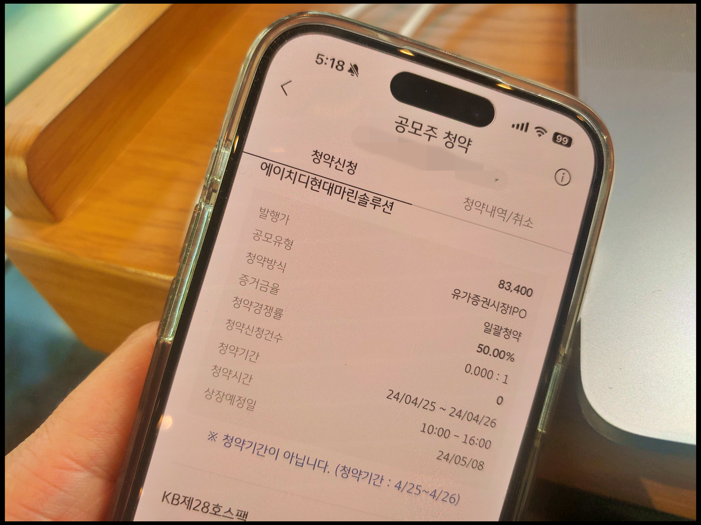 [사진 = 만약 에이치디현대마린솔루션 KB증권 모바일 통해서 진행하시면 메뉴 상단에 있는 '공모주/청약' 항목의 세부 항목인 '청약 > 공모주 청약'으로 들어가시면 됩니다. 4월 25일 ~ 26일(오전 10시 ~ 오후 4시)에 걸쳐 해당 공모주 청약 신청 가능합니다. 얼마 전 해당 증권사에서는 제일엠엔에스 공모주 청약 진행됐습니다. 저는 균등 1주 배정 받았습니다. 오는 4월 30일 상장 예정이라고 합니다. (C) KB증권 앱]