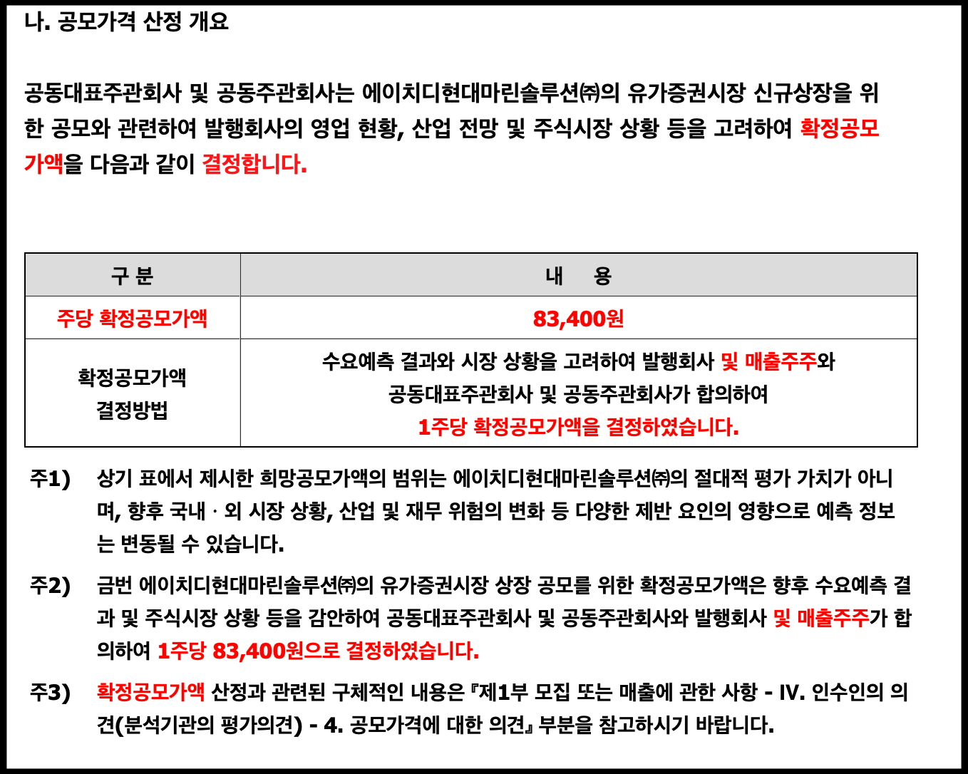 [사진 = 에이치디현대마린솔루션 공모가 83,400원 확정됐습니다. 일반 청약자 물량 가장 많은 곳은 KB증권입니다. (C) DART 공식 홈페이지]