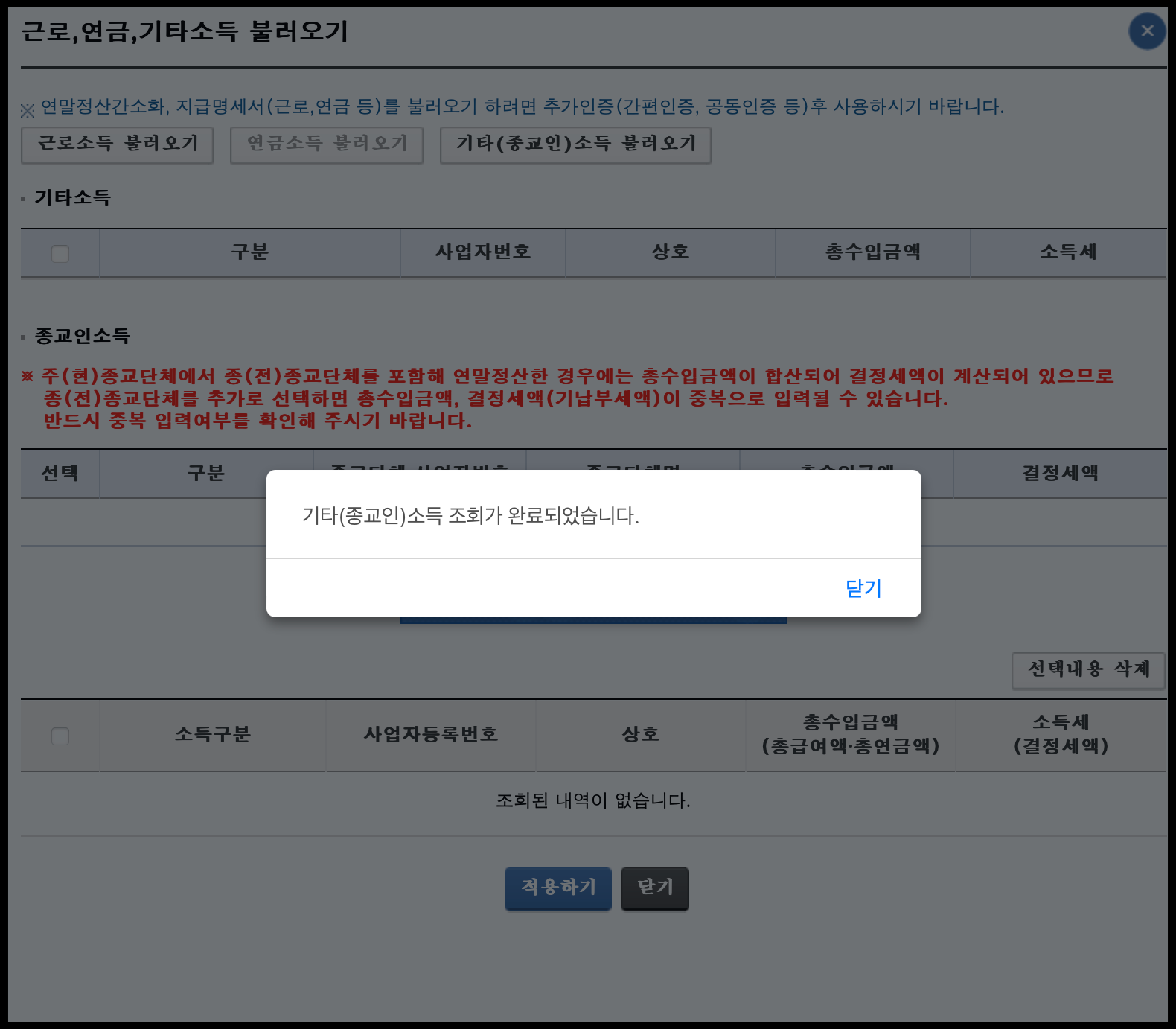 소득종류 선택(복수선택 가능)에서 소득종류 변경하시면 됩니다. 기타소득 항목을 체크했습니다. 그러면 조회가 완료되었다는 창이 뜨면서 저의 기타소득 2건이 등장했습니다. 이를 적용하시면 됩니다.