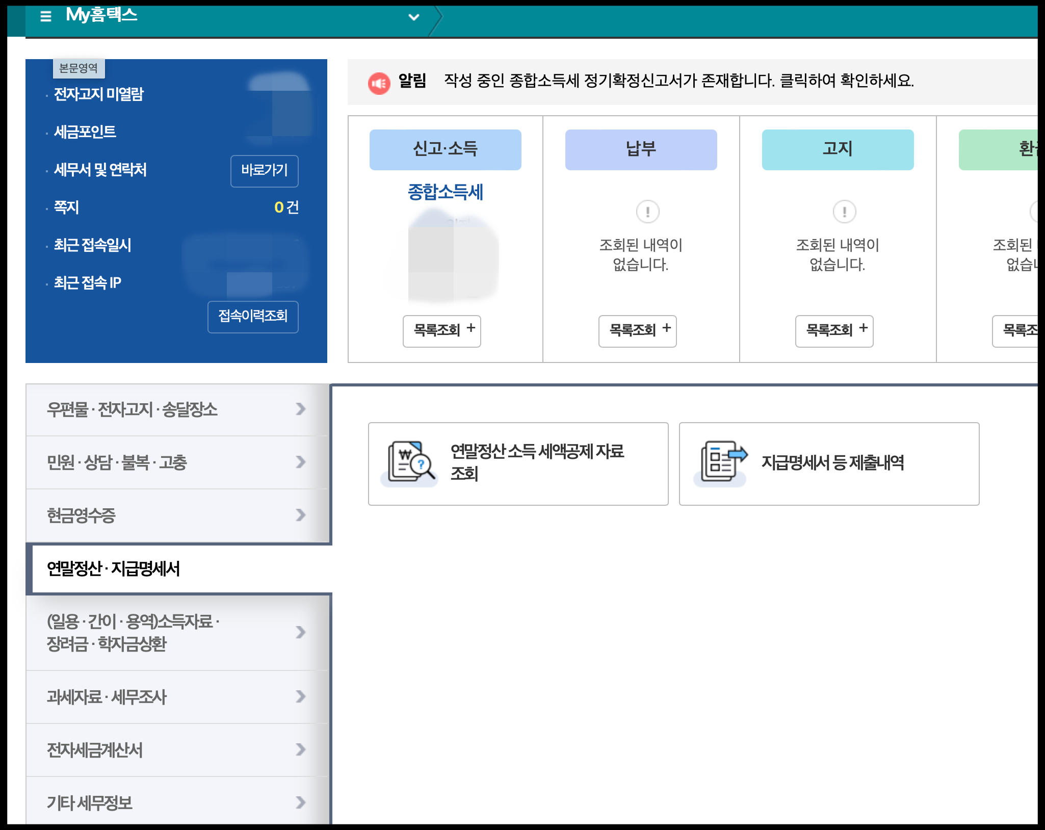 종합소득세 기타소득 적용 방법 다음과 같습니다. 국세청 홈택스 홈페이지 메인 상단에 있는 'My홈택스' 메뉴로 들어가신 뒤, '연말정산, 지급명세서' 메뉴 내에 있는 '지급명세서 등 지출내역'으로 들어가시면 됩니다.