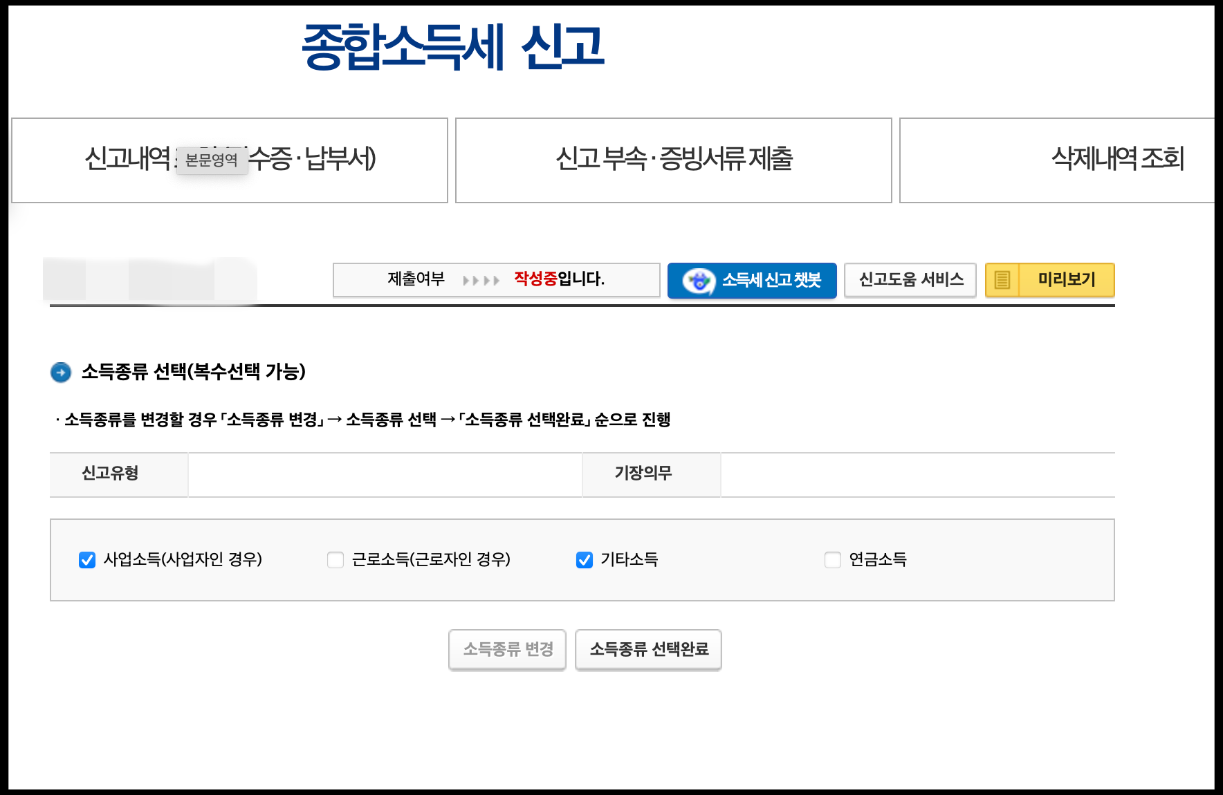 종합소득세 신고방법 중에서 신고서 제출하기 전에 소득종류 선택하는 곳이 있습니다. 저는 혹시나 싶어서 기타소득 체크를 해봤는데 소득 종류에 기타소득이 나오지 않은 것을 확인했습니다. 기타소득이 뜨지 않았음을 알아챘습니다.