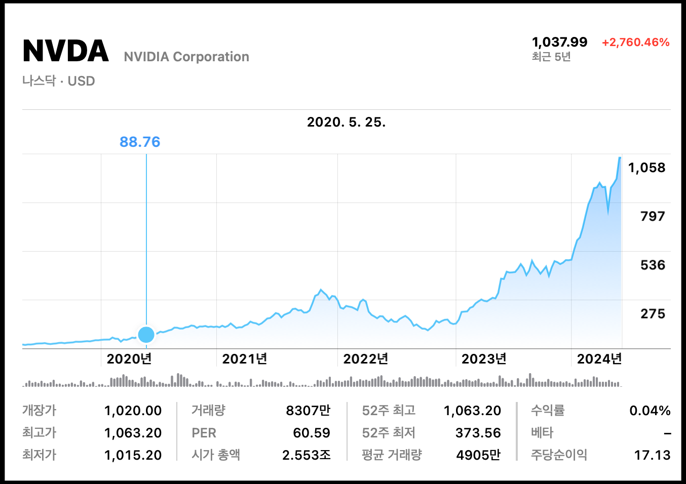 -2024년 1분기 실적 대박, 영업이익 1년 만에 8배 증가...주가 사상 첫 1,000달러 돌파(5월 23일 1,037.99달러 마감)