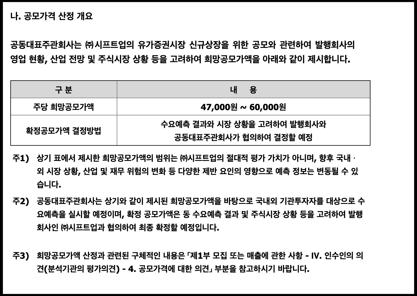 [사진 = 시프트업 공모주 희망 공모가 밴드 47,000원 ~ 60,000원입니다. 기관 수요예측 결과 나오면 이 금액이 어떻게 확정될지 주목됩니다. 최근에 기관 반응 좋았던 종목들을 보면 최종 공모가 금액을 희망 공모가 밴드 최상단에서 올리는 경우가 흔했습니다. 반면 HD현대마린솔루션은 올리지 않으면서 희망 공모가 밴드 최상단 금액 그대로 확정된 차이점이 있습니다. (C) DART 공식 홈페이지]