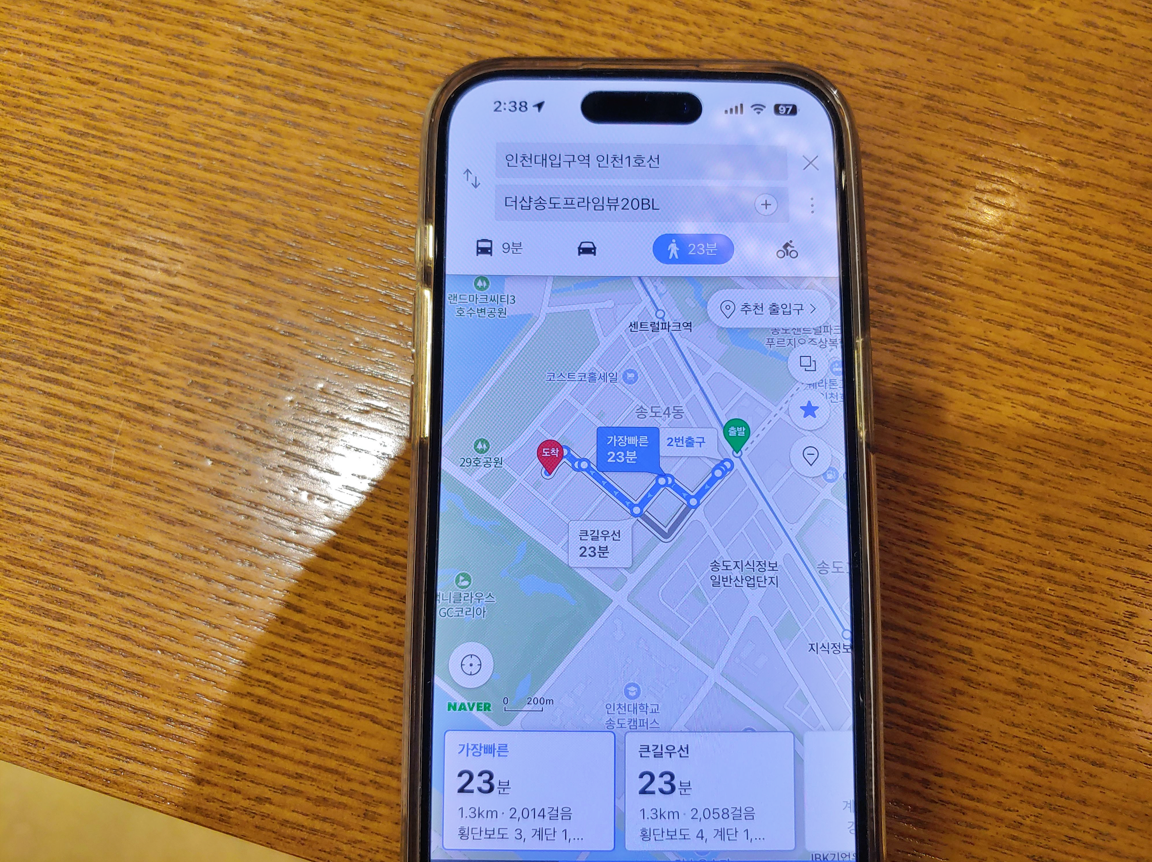 [사진 = 더샵송도프라임뷰 20BL 줍줍 청약 관련하여 오는 2030년 GTX-B 신설 예정으로 알려진 인천대입구역과의 이동시간 이렇습니다. 버스 9분 및 도보 23분 소요됩니다. 비록 역세권은 아니지만 버스 9분이면 소요 시간이 짧습니다. 걷는 것을 좋아하시는 분들 중에는 도보 23분이면 충분히 걸어갈 수 있다고 판단하는 분들이 계실 것으로 보입니다. 저 같이 만보기 앱을 주로 이용하시는 분이라면 도보 23분을 통해서 포인트 모으기 좋은 이점도 있을 겁니다.(만보기 앱이 2030년에도 사람들에게 활발히 이용된다는 전제하에 말입니다.) (C) 네이버 지도 앱]