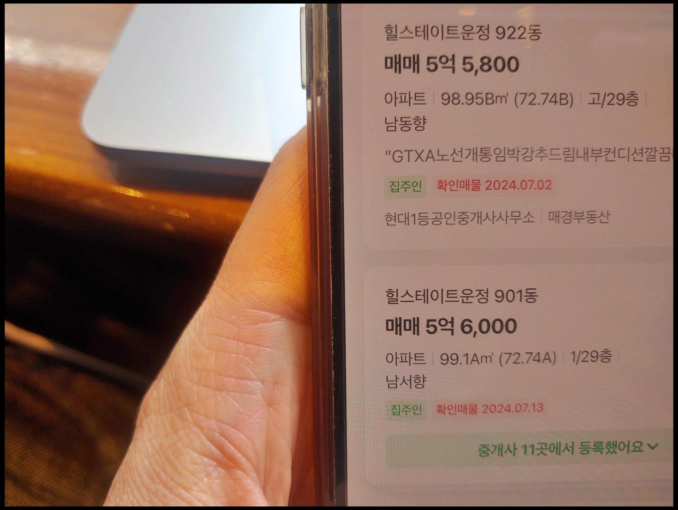[사진 = 제일풍경채 운정 A45 분양가 관련하여 옆에 있는 힐스테이트 운정(2,998세대, 2018년 7월 입주 시작) 72타입 살펴봤습니다. 최소 5억 5,800만 원(고층) 5억 6,000만 원(1층) 나왔습니다. 1층 매물의 경우 산내초 및 운정고와 가깝습니다. 5억 후반대 매물들이 꽤 보였습니다. 제일풍경채 운정 A45 74타입 주로 4억 원대였음을 떠올리면 시세 차익 1억 원대임을 알 수 있습니다. (C) 네이버 부동산]