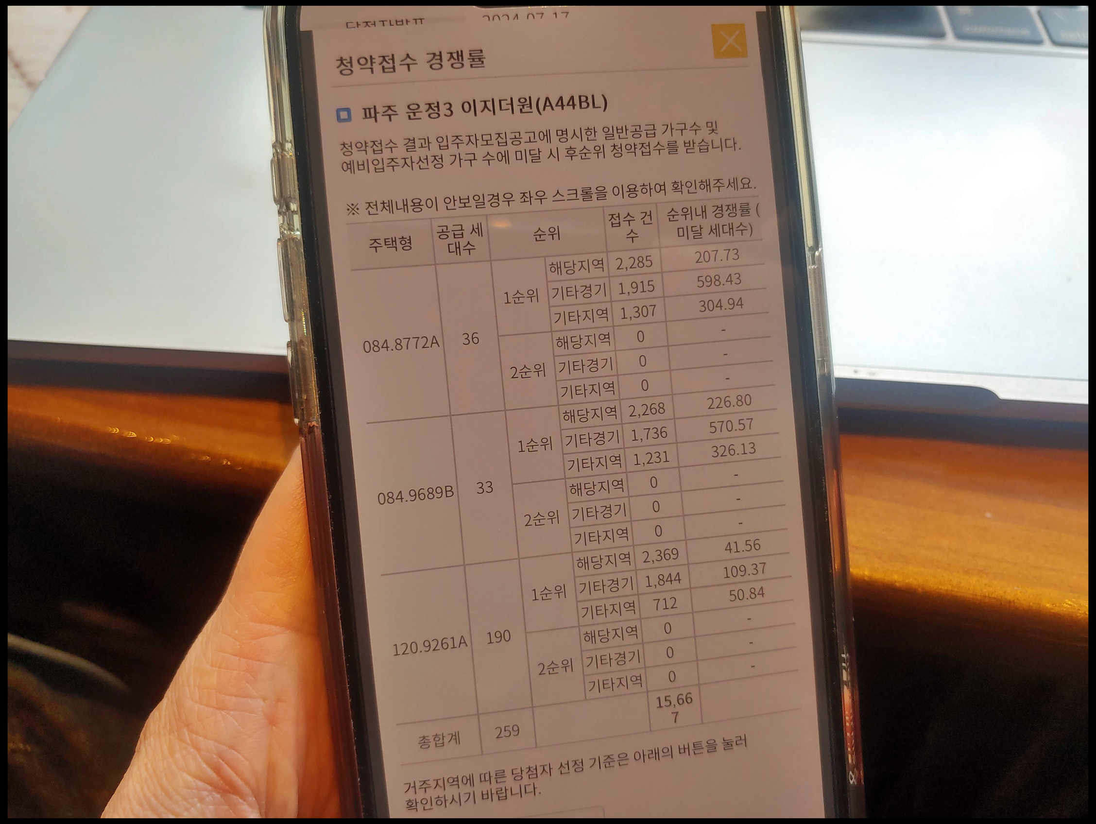 [사진 = 2024년 7월 2째 주에 파주 운정3 이지더원 A44BL 청약 진행됐습니다. 제일풍경채 운정 A45 옆에 있는 곳입니다. 특별공급 총 2,302건 및 일반공급 총 15,667건 청약신청 진행됐습니다. 1만 7천 명 이상 청약신청했을 정도로 흥행했습니다. 이러한 특징을 놓고 보면 제일풍경채 운정 A45 청약 흥행 가능성이 꽤 있습니다. (C) 청약홈 앱]
