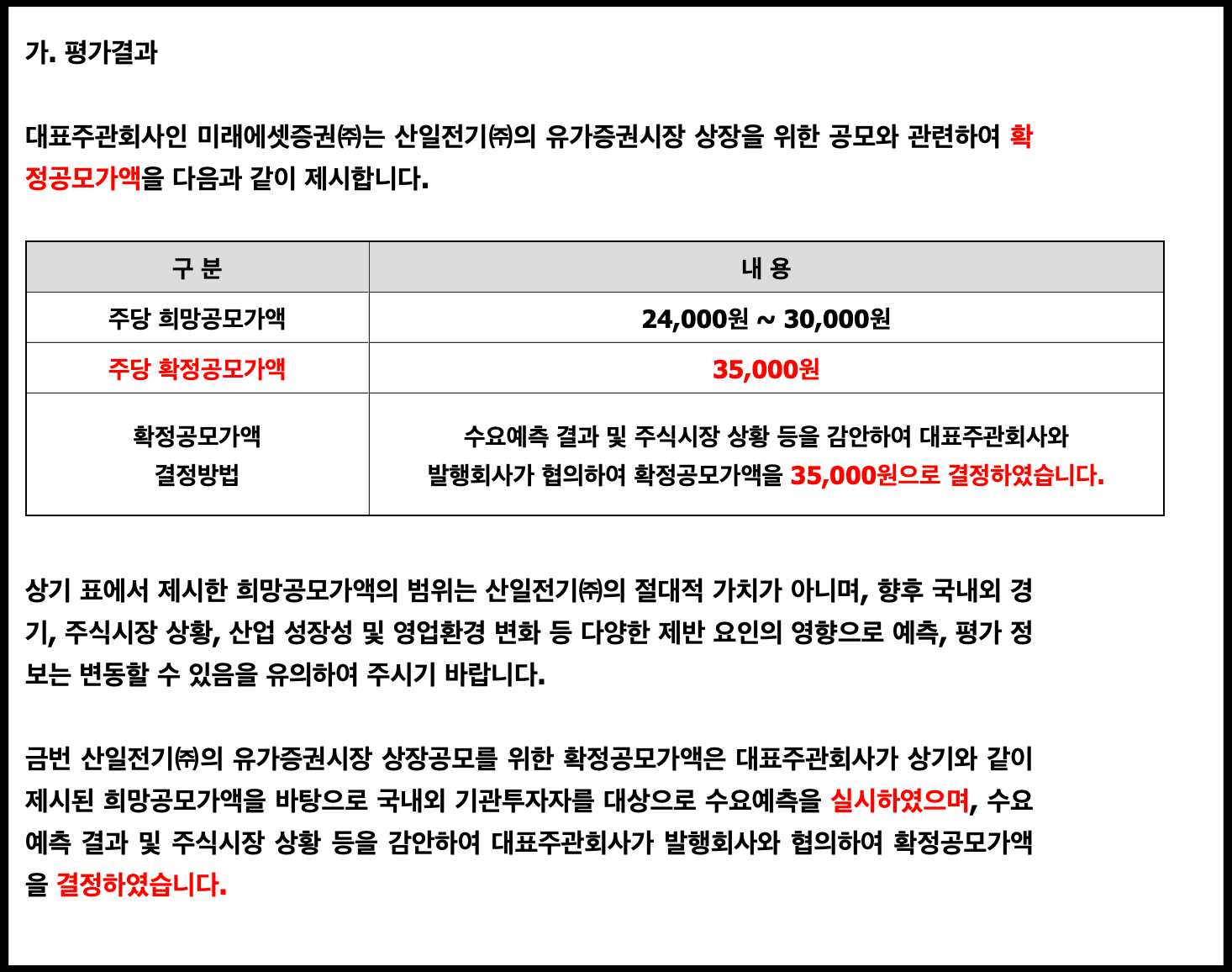 [사진 = 산일전기 공모주 공모가 35,000원 확정됐습니다. 총 760만 주 발행하는 이 종목의 공모액은 2,660억 원 및 시가총액 1조 656억 원 됩니다. 규모가 어마어마합니다. 당초 희망 공모가 밴드는 24,000원 ~ 30,000원이었으나 기관 반응이 좋게 나오면서 35,000원으로 상향됐습니다. 지난 1년 동안 상장했던 공모주 대부분 수요예측 결과가 좋게 나왔을 때 희망 공모가 밴드 최상단에서 금액을 더 올리는 경우가 많았습니다. 다만, 최근 등장했던 일부 공모주들의 상장 첫 날 흐름이 좋지 않은 점이 변수입니다. 이 종목은 그 분위기를 깨는 기분 좋은 터닝 포인트가 될 수 있을지 궁금합니다. (C) DART 공식 홈페이지]