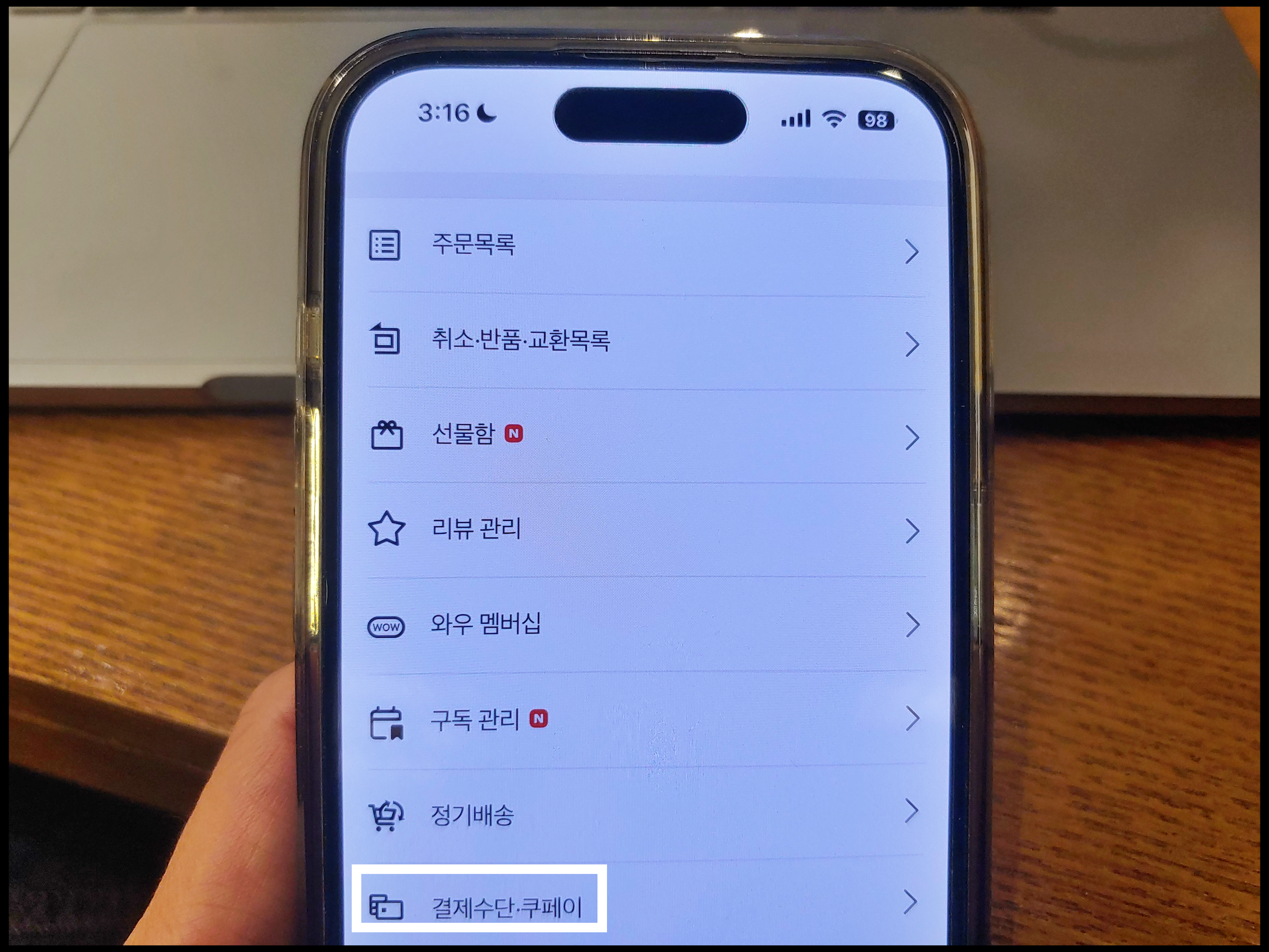 -결제수단/쿠페이 메뉴에서 카드 등록(아이폰14/15 때는 국민, 농협, 롯데, BC, 삼성, 신한, 하나카드 적용)