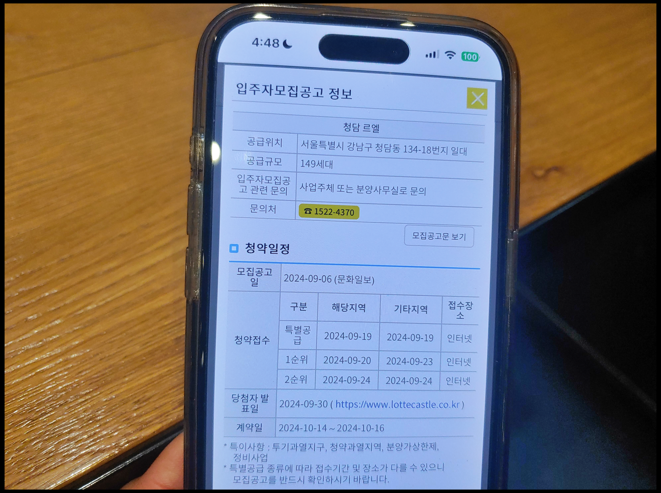 [사진 = 청담 르엘 청약 일정 이렇습니다. 특별공급 9월 19일 목요일, 일반공급 해당지역 9월 20일 금요일 및 기타지역 9월 23일 월요일, 일반공급 2순위 9월 24일 화요일입니다. 당첨자 발표일 9월 30일 월요일, 서류접수 10월 1일 화요일 ~ 10월 4일 금요일, 계약일 10월 14일 월요일 ~ 10월 16일 수요일입니다. 청담 르엘 일반분양 149세대 중에 특별공급 64세대 및 일반공급 85세대입니다. 특별공급 64세대 중에는 신혼부부 25세대, 기관추천/다자녀가구/생애최초 12세대 씩, 노부모부양 3세대 입니다. 특별공급 물량 중에 40%가 신혼부부에게 돌아갑니다. (C) 청약홈 앱]