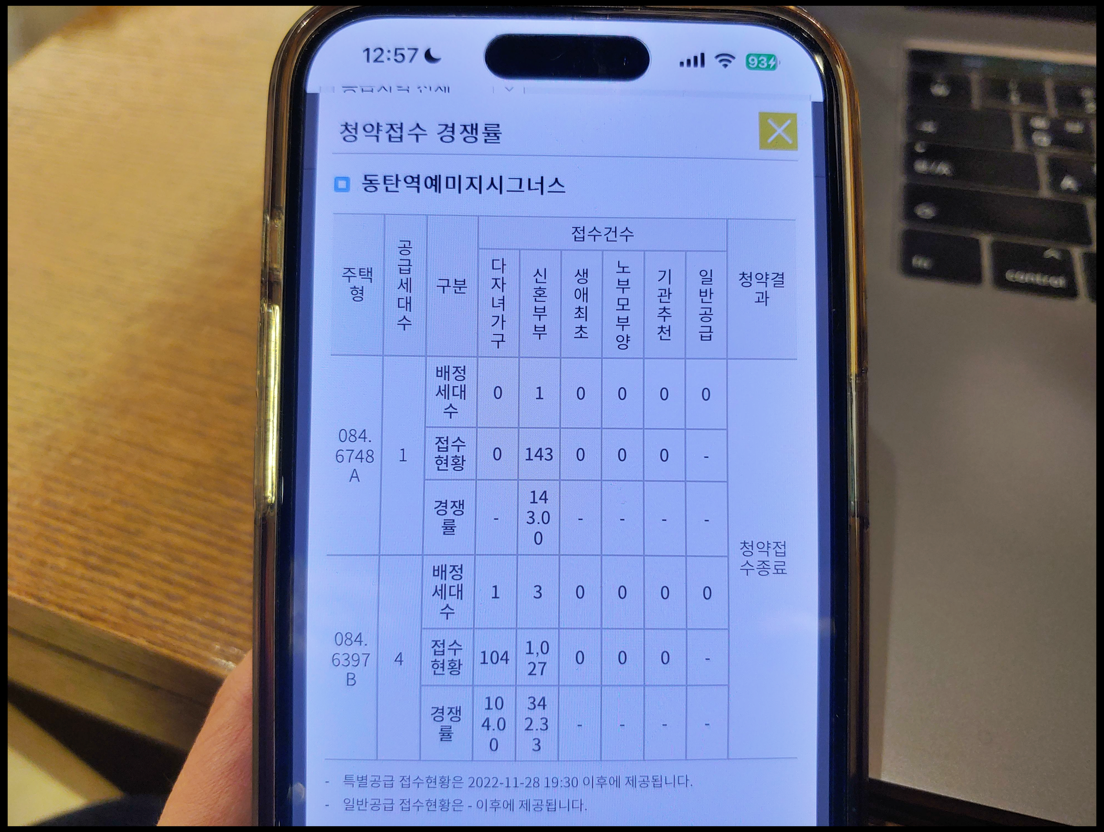 [사진 = 동탄역 예미지시그너스 줍줍 청약 2022년 11월 말에 특별공급 5세대 진행됐습니다. 다자녀가구 84B 1세대 104건 및 신혼부부 84A 1세대 143건, 신혼부부 84B 3세대 1,027건 신청된 적이 있습니다. 2년이 지난 2024년 9월 현재 신혼부부 84A 1세대 줍줍 진행됩니다. 2년 전에 비해서 청약건수가 어떻게 나올지 알 수 없으나 만약 적게 나오면 오히려 당첨 확률이 조금이라도 높아집니다. 반대로 청약건수 많으면 당첨 확률은 낮아진다고 보시면 됩니다. 1세대 모집이기 때문입니다. (C) 청약홈 앱]