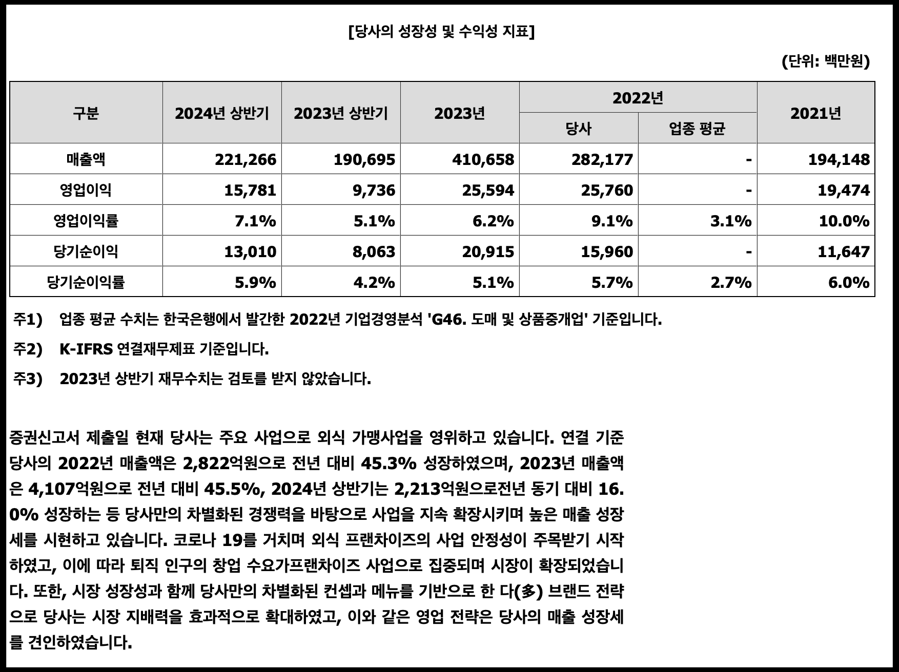 [사진 = 더본코리아 공모주 매출 흐름이 인상적입니다. 2022년 매출액 2,822억 원, 영업이익 258억 원, 당기순이익 160억 원습니다. 2023년 매출액 4,107억 원, 영업이익 256억 원, 당기순이익 209억 원 기록하며 전년도보다 더 높은 성장을 나타냈습니다. 2024년 상반기 매출액 2,213억 원, 영업이익 158억 원, 당기순이익 130억 원 기록했는데 모두 2023년 상반기보다 앞섭니다. 이 흐름이라면 2023년 매출액을 넘어설 것으로 보입니다. 흑자 규모가 늘어나는 점도 좋습니다. 수익성 좋은 기업인 것은 분명합니다. (C) DART 공식 홈페이지]