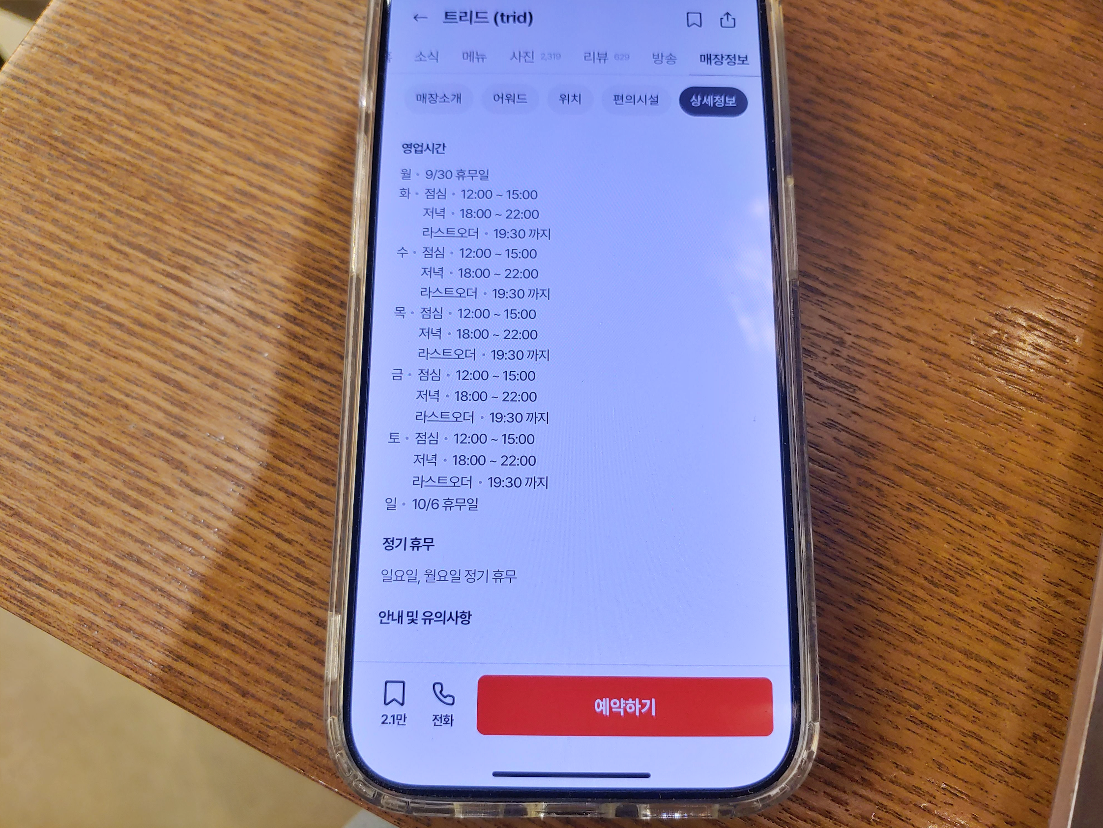 [사진 = 흑백요리사 트리플스타 식당 레스토랑으로 화제가 된 트리드는 미쉐린가이드 서울 2024 및 3년 연속 선정됐습니다. 매주 일요일과 월요일이 정기 휴무일이며 12시부터 오후 10시까지(오후 3시 ~ 오후 6시 브레이킹 타임) 운영됩니다. 참고로 라스트오더는 오후 7시 30분까지입니다. 만약 예약 시간 20분 넘으면 노쇼 처리 되며, 노키즈 존으로 운영된다고 합니다. (C) 캐치테이블 앱]