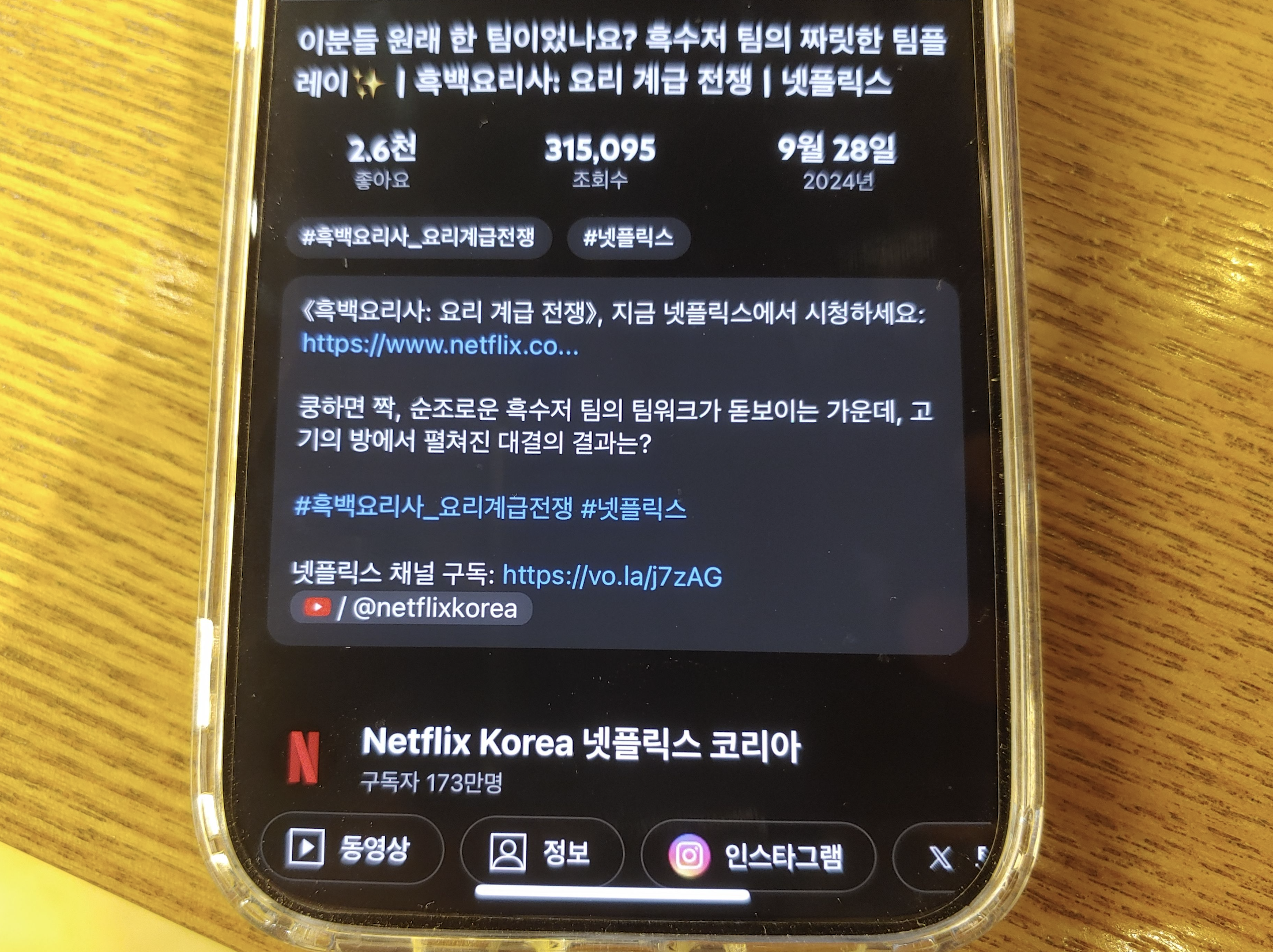 [사진 = 넷플릭스 코리아 공식 유튜브에서는 흑백요리사 트리플스타 팀장으로 활약했던 흑수저 팀의 활약상 담은 영상을 올렸습니다. 업로드된지 이틀 만에 조회수 30만 뷰 넘으면서 누리꾼들의 화제를 모았습니다. 나이 및 요리 장르가 전혀 다른 셰프 6명이 하나의 팀으로 뭉치며 서로 호흡이 잘 맞는 모습을 보였습니다. 이 과정에서 흑백요리사 강승원 셰프 향한 시청자들의 반응이 좋았습니다. 이 팀의 조리 과정을 넷플릭스로 시청하면서 편안한 기분을 느낄 수 있었습니다. (C) 넷플릭스 코리아 유튜브]