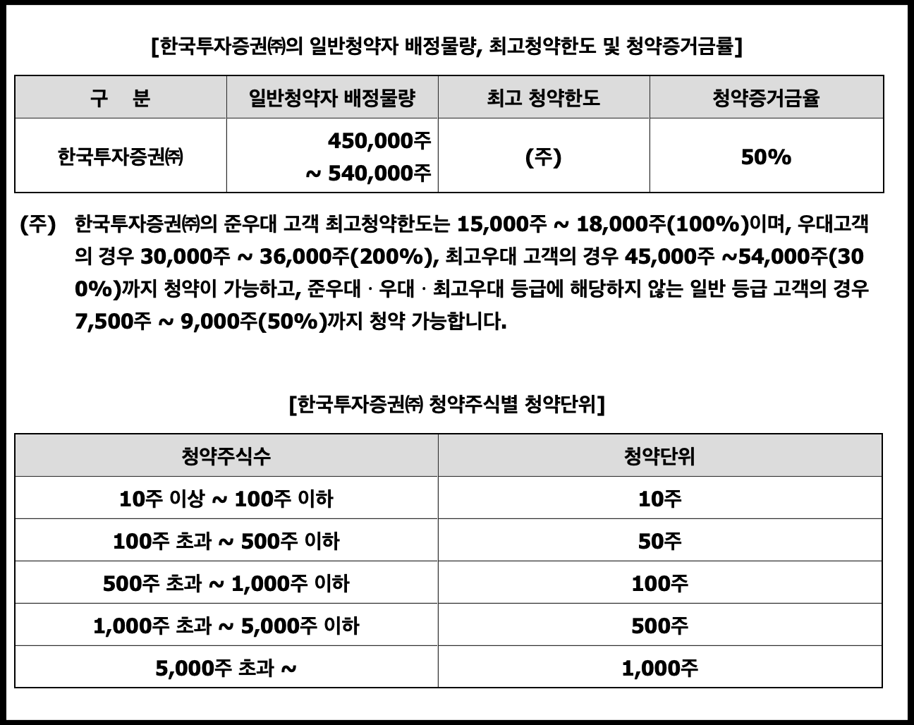 - 균등 및 비례 배정 수량 : 225,000주 ~ 270,000주 (한투) 150,000주 ~ 180,000주 (NH)