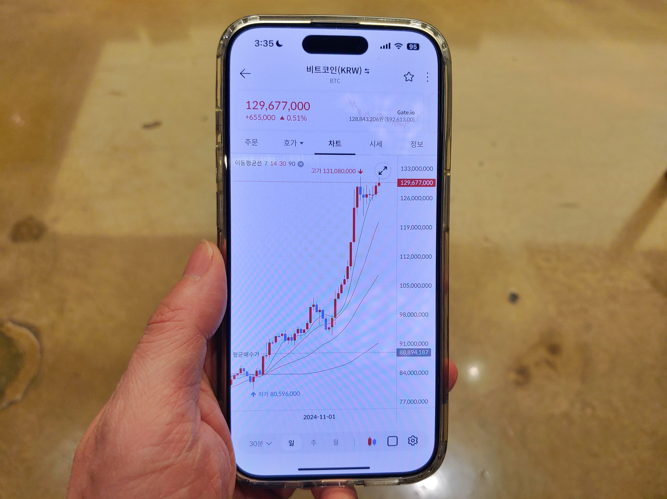 [사진 = 비트코인 빗썸 시세 11월 20일 1억 3천만 원 돌파했습니다. 이날 오후에는 다시 1억 2,900만 원대로 내려갔으나 며칠 만에 다시 1억 3천만 원대 찍었습니다.(최고점 131,080,000원) 트럼프 당선 이전에는 8천만 원 기록했는데, 이제는 그때보다 더 올랐습니다. 트럼프 비트코인 우호적인 포지션에 있는 인물로서 미국 대통령 당선되었기 때문입니다. 국내 연예인이 과거에 비트코인으로 짜장면 사먹었던 일화가 있었음을 떠올리면 앞으로의 미래는 알 수 없는 것 같습니다. (C) 빗썸 앱]