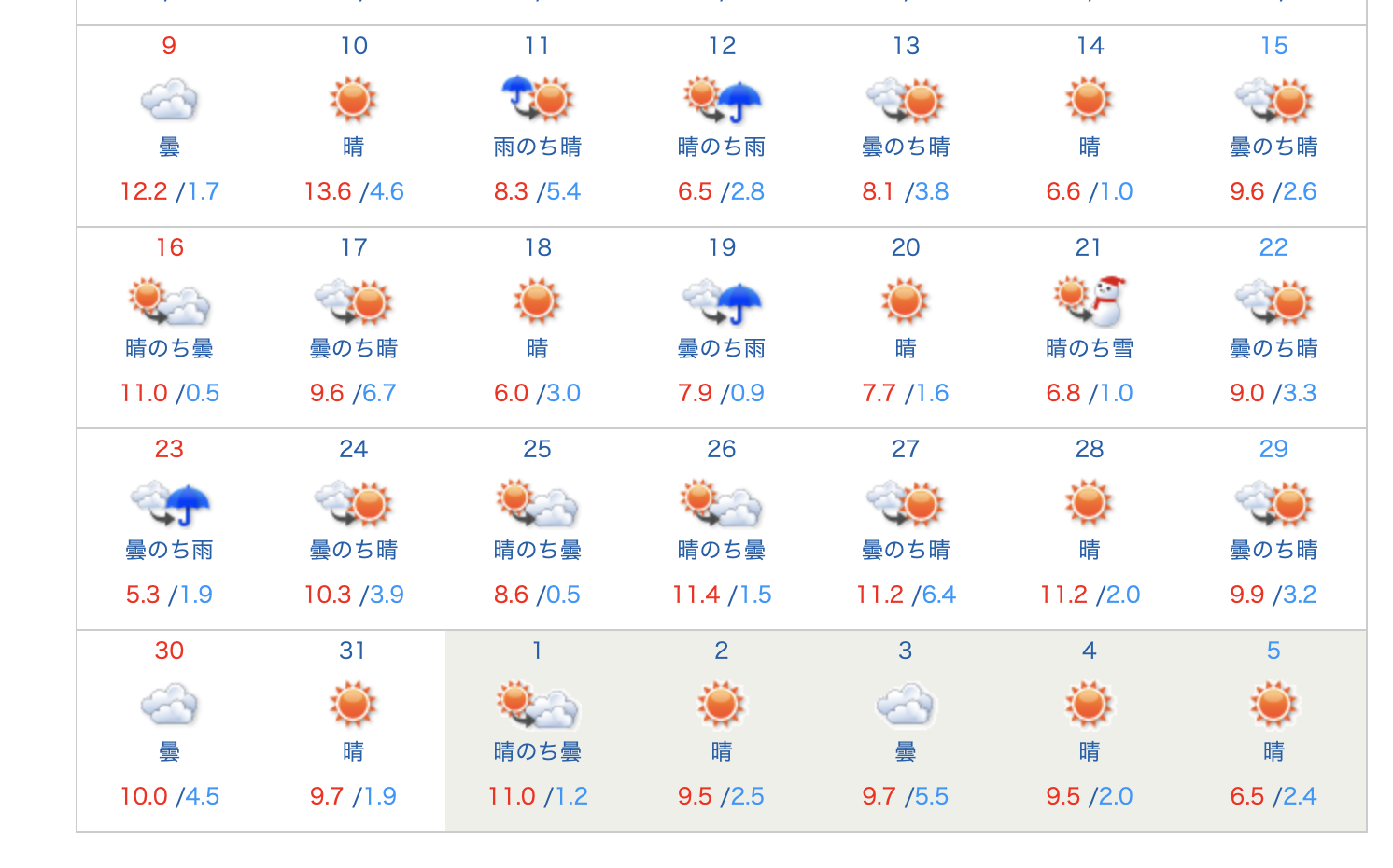 [사진 = 2023년 오사카 1월 날씨 이렇습니다. 최저 기온 영하로 떨어졌던 날은 단 이틀 뿐입니다.(1월 25일, 29일) 1월 중순에는 최저 기온 10도 이상이었던 날들도 있었습니다. 이때는 1월초가 따뜻한 반면, 1월말은 쌀쌀했습니다. (C) 일본기상협회 홈페이지(tenki.jp)]