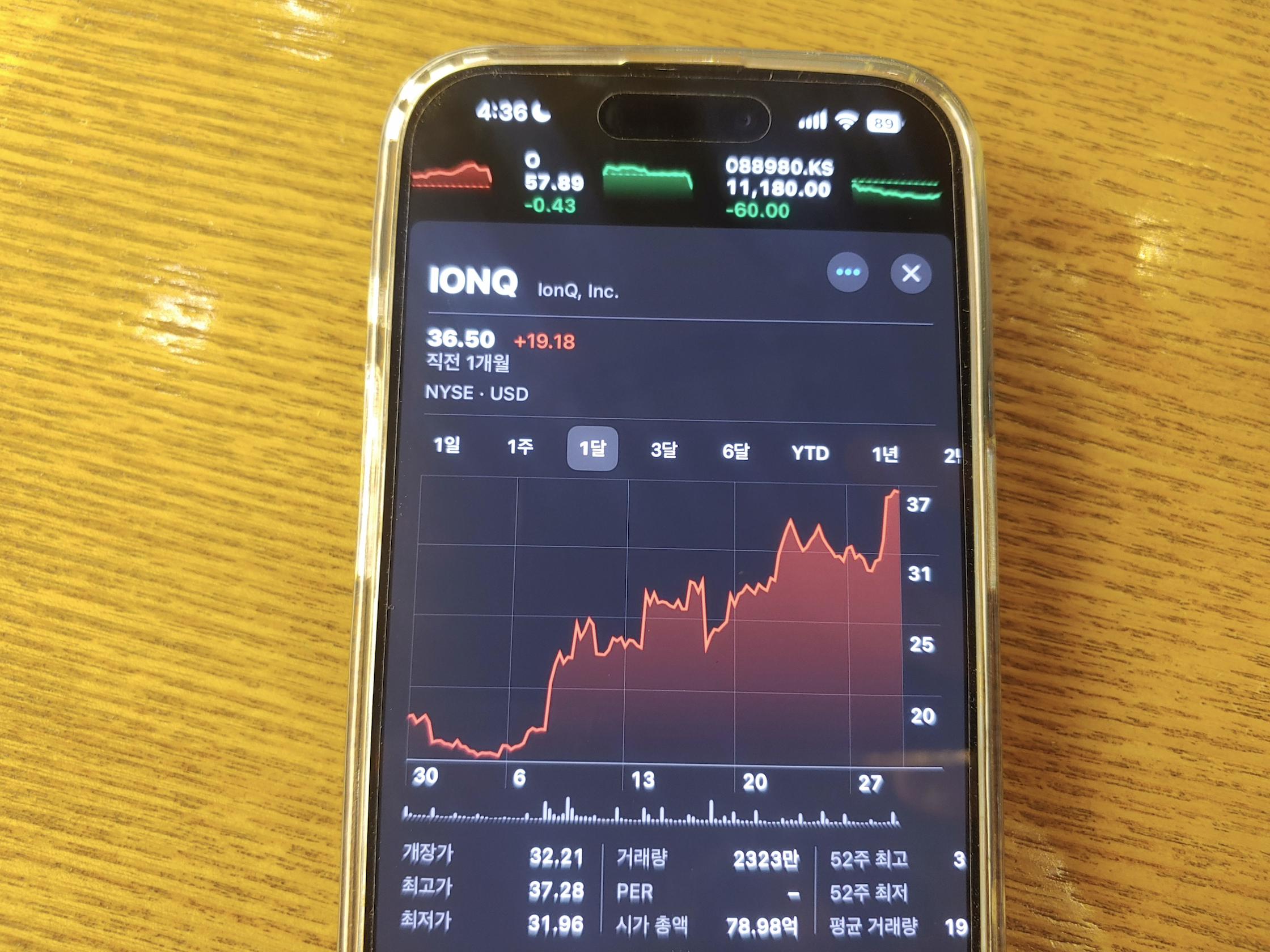 [사진 = 아이온큐 양자컴퓨터 관련주 미국 종목 중에서 최근에 가장 핫합니다. 해당 기업의 주가 지수가 지난 3개월 사이에 5배 올랐습니다. 3개월 전에는 7.42달러였는데 현재는 36.50달러 입니다.(+29.08달러 상승) 한때는 37.28달러까지 치솟았습니다. 이렇게 5배 올랐다는 것은 아이온큐 양자컴퓨터 관련주 종목 중에서 가장 눈에 띄는 기업임을 알 수 있습니다. 일각에서 양자컴퓨터 대장주 종목으로 거론되기도 합니다. 물론 IBM, 마이크로소프트 같은 유명 IT 기업들도 양자컴퓨터 분야에서 활동중이라 과연 어느 종목이 가장 확실한 대장주인지 알 수 없는 측면도 있습니다. 아이온큐는 이들과 달리 양자컴퓨터 전문적으로 다루면서 스타트업이라는 차이점이 있습니다. (C) 아이폰 주식 앱]