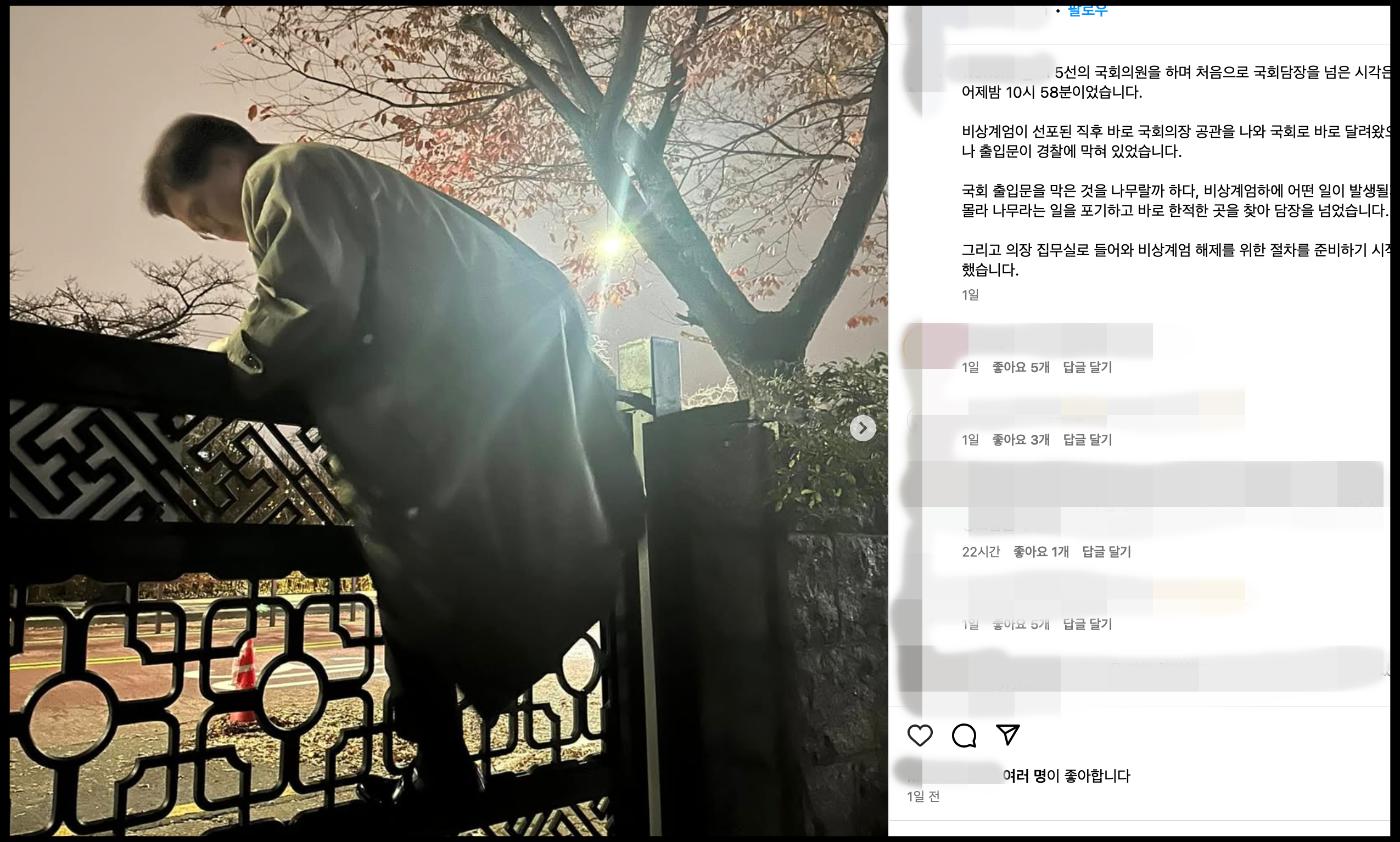 [사진 = 우원식 국회의장은 지난 4일 인스타그램을 통해 3일 저녁 비상계엄령 당시의 상황을 전했습니다. 선포 직후 국회의장 공관에서 국회로 바로 달려왔으나 출입문이 막혀 있었다고 합니다. 그러자 담장을 넘으며 의장 집무실 도착했다고 합니다. 국회의원 5선을 하면서 처음으로 국회 담장을 넘었다고 합니다. (C) 우원식 국회의장 인스타그램]