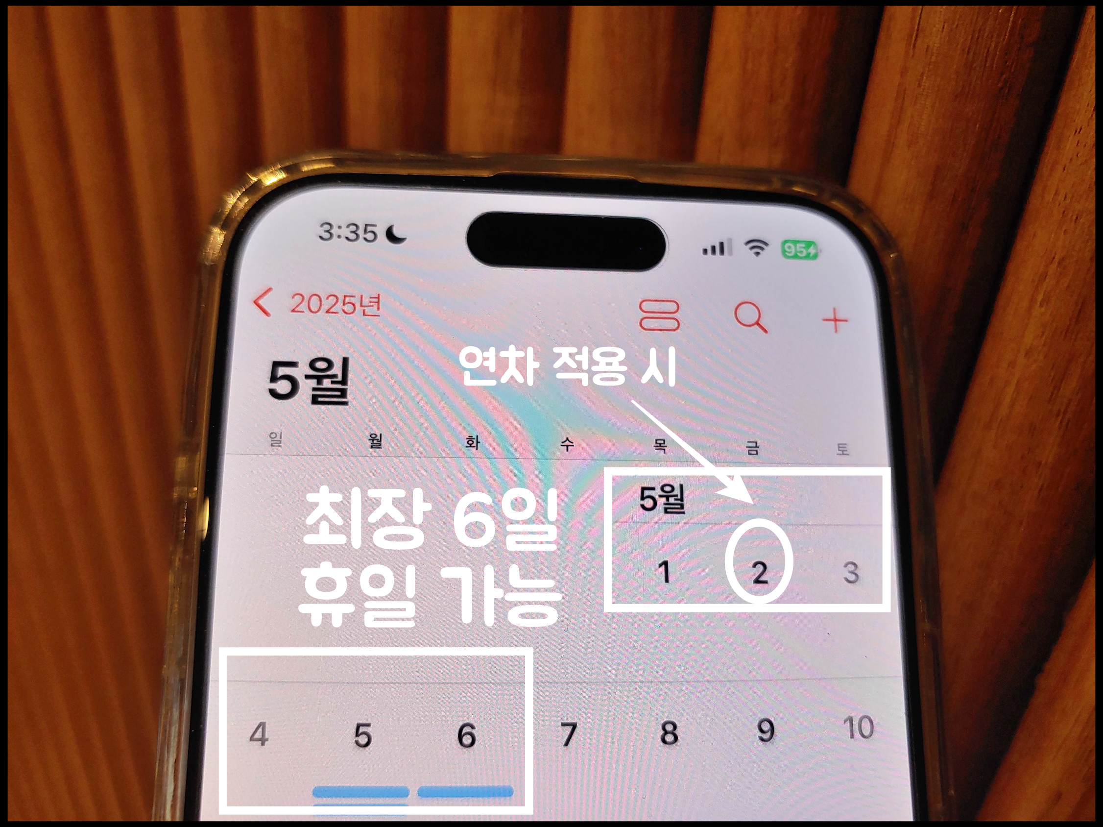 5월 1일(목) 근로자의 날, 5월 2일(금) 연차, 5월 3~6일(토~화) 주말, 어린이날, 부처님오신날 대체공휴일. 총 6일