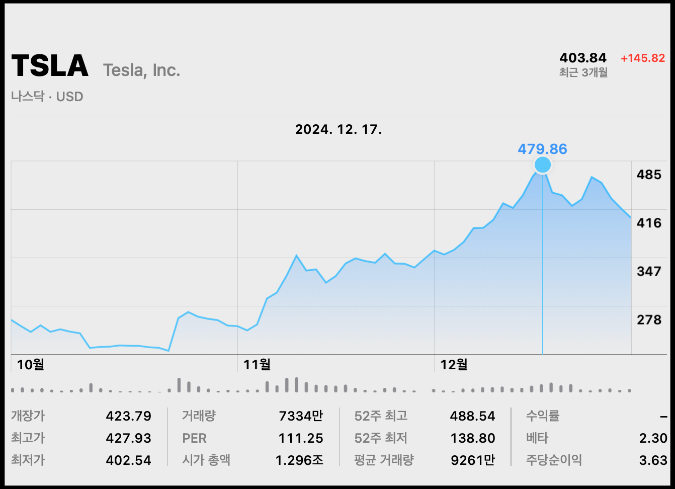 [사진 = 트럼프 당선 이후 미국주식 중에서 가장 주목받았던 종목은 테슬라입니다. 지난 11월 초 당선 이후 12월 중순까지 가파른 오름세를 나타냈습니다. 한때 488.53달러까지 올랐습니다. 그러다가 12월 31일 403.84달러로 마감했습니다. 12월 말에는 조정을 받았습니다. 결과적으로 이 종목은 산타랠리가 일찍 앞당겨졌습니다. 트럼프 취임식 이후에는 어떤 추이를 나타낼지 알 수 없습니다. 변동성 높은 종목이기 때문입니다. 해당 기업 최고경영자(CEO) 일론 머스크가 트럼프 정부에서 얼마나 주도적인 역할을 할 수 있는지, 트럼프 정부의 자율주행 규제 완화 가능성, 테슬라의 중국 시장 영향력이 중요하게 됐습니다. (C) 맥북 주식 앱]