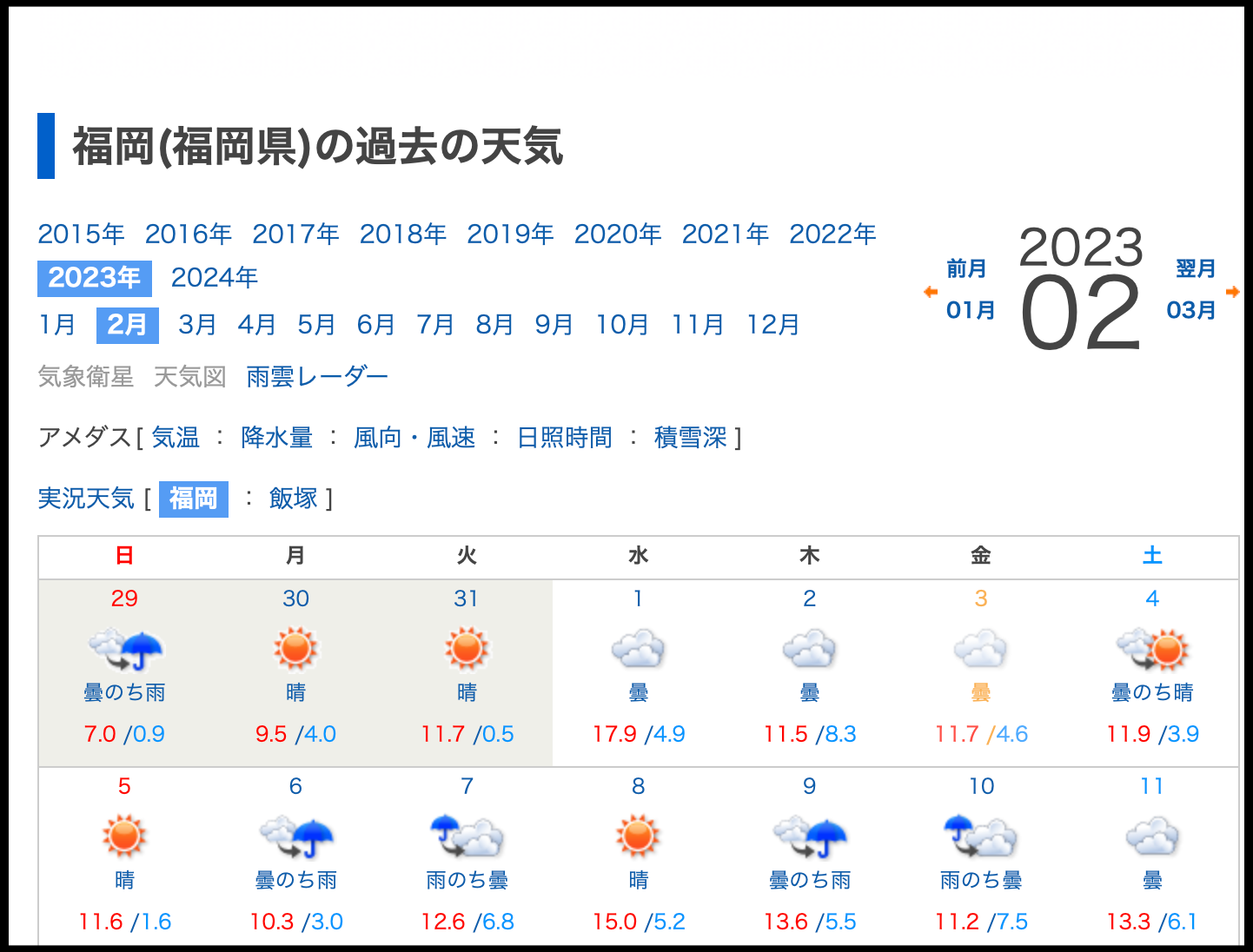 [사진 = 2023년 일본 후쿠오카 2월 날씨. 최저 기온 5도 이하였던 날이 14일입니다. 최고 기온 20도 이상이었던 날은 없었습니다. 최저 기온이었던 날은 2월 5일(1.6도)이었으며, 최고 기온이었던 날은 2월 1일(17.9도) 입니다. 2024년 해당 달에 비하면 쌀쌀했던 쪽에 가깝습니다. (C) 일본 기상협회 홈페이지(tenki.jp)]