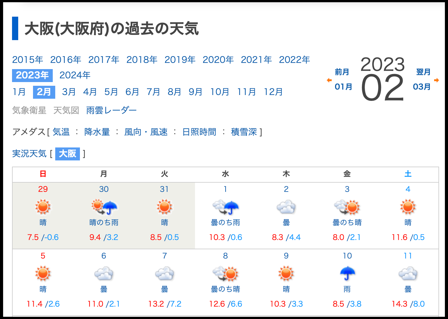 [사진 = 2023년 오사카 2월 날씨 이렇습니다. 이날 17일이 유일하게 최저 기온 영하로 내려갔습니다.(-0.1도) 그 외에는 모두 영상입니다. 이때는 최고 기온 10도 이상이었던 날이 19일 됩니다. 2024년에 비해 5일 정도 적었습니다. (C) 일본기상협회 홈페이지(tenki.jp)]