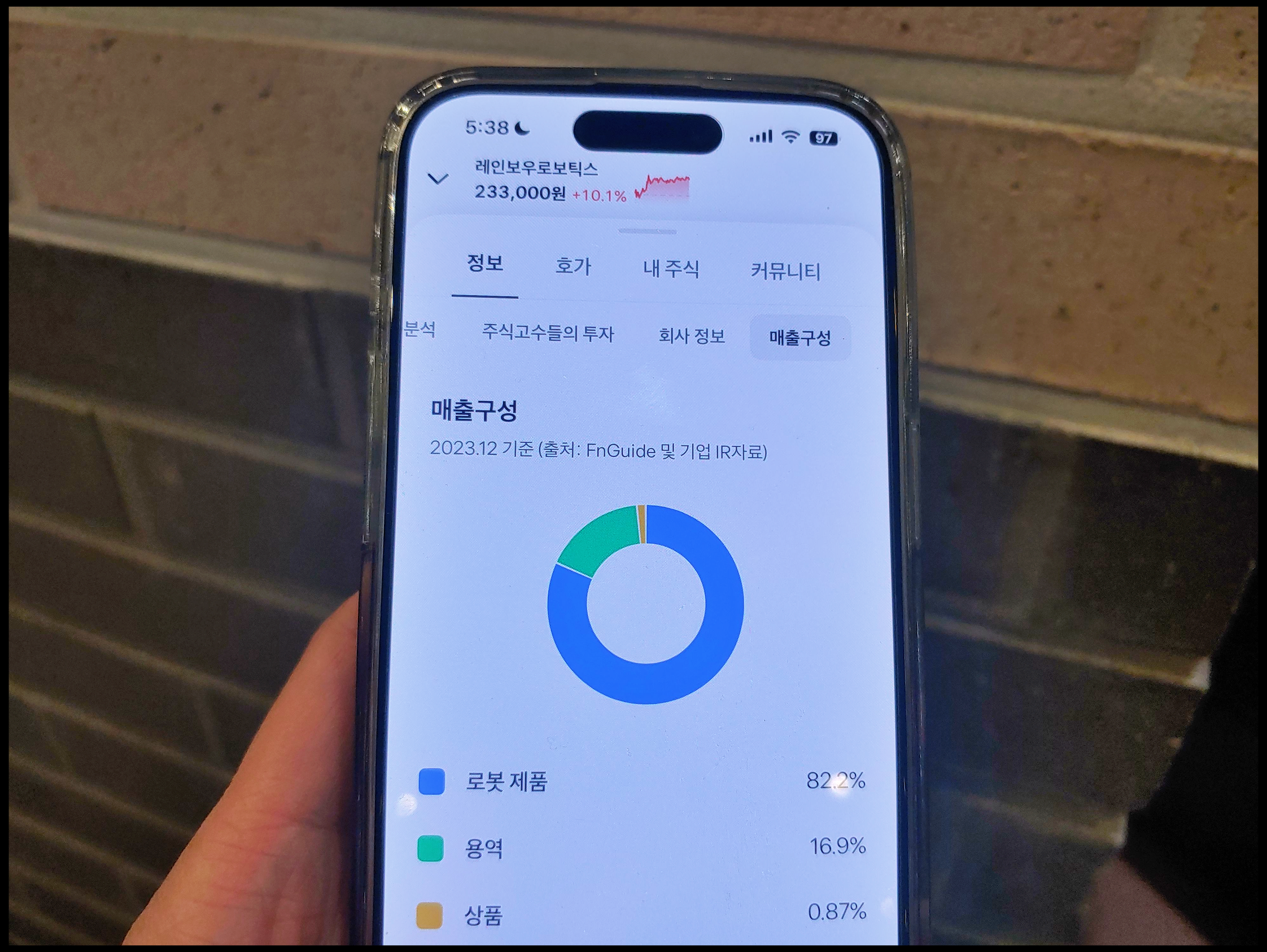 [사진 = 레인보우로보틱스 주가 삼성전자 자회사 편입 소식으로 1월 2일과 3일에 강세를 나타냈습니다. 1월 3일에는 2일에 비해 거래량 7배 이상 늘었다고 합니다. 주로 외국인 및 기관에서 매수세 강했습니다. 30% 급등했던 지난 2일에는 개인 매수세 두드러졌는데 다음날에는 달라졌습니다. 이 회사 매출의 82.2%가 로봇 제품에서 나오는 점도 눈에 띕니다. (C) 토스 앱]